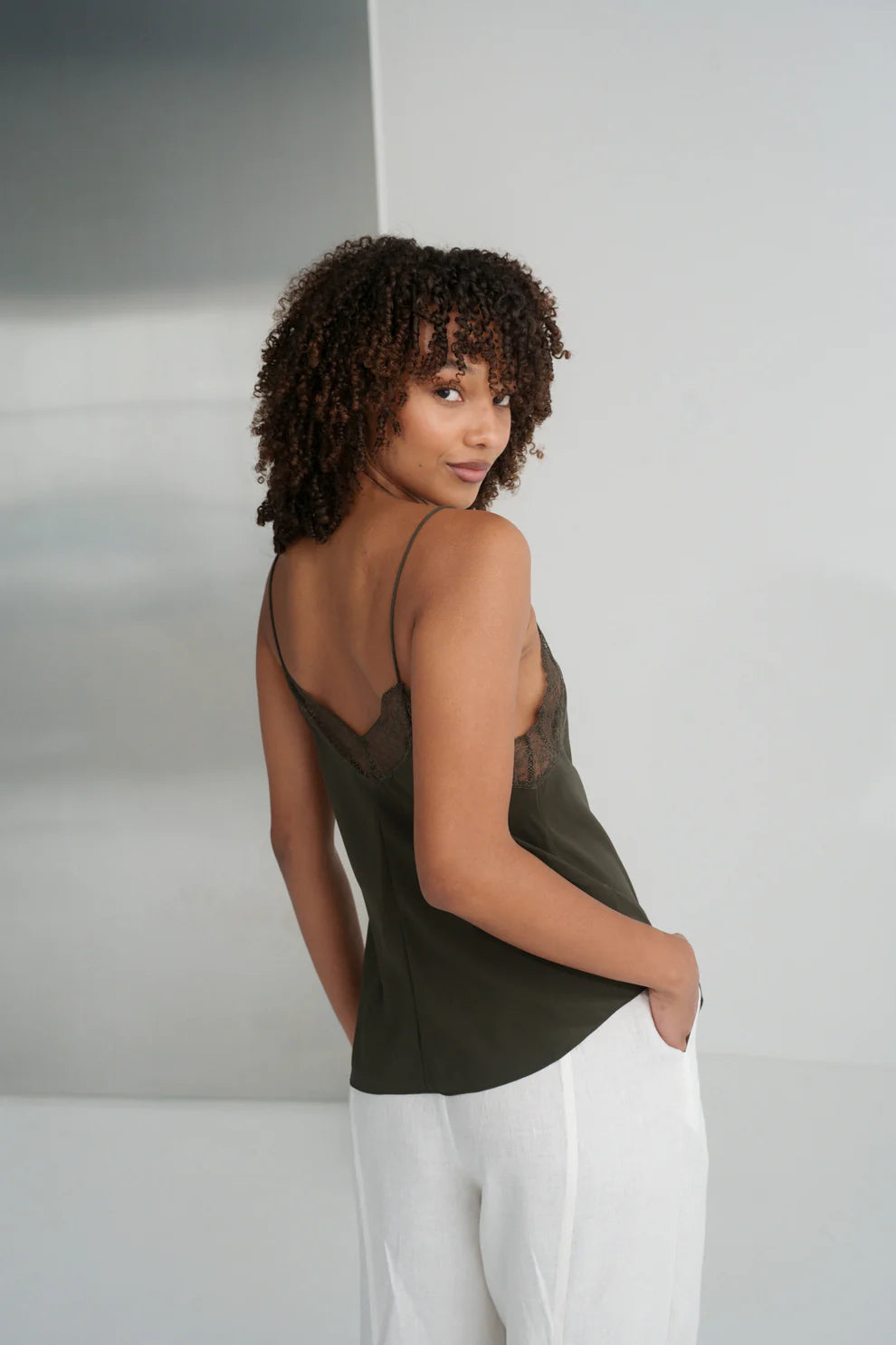 The FRANKIE cami is made with 100% bluesign-certified silk for a luxurious feel. Boasting a bias cut and lace accents on the front and back, this cami features French seams for a polished touch.