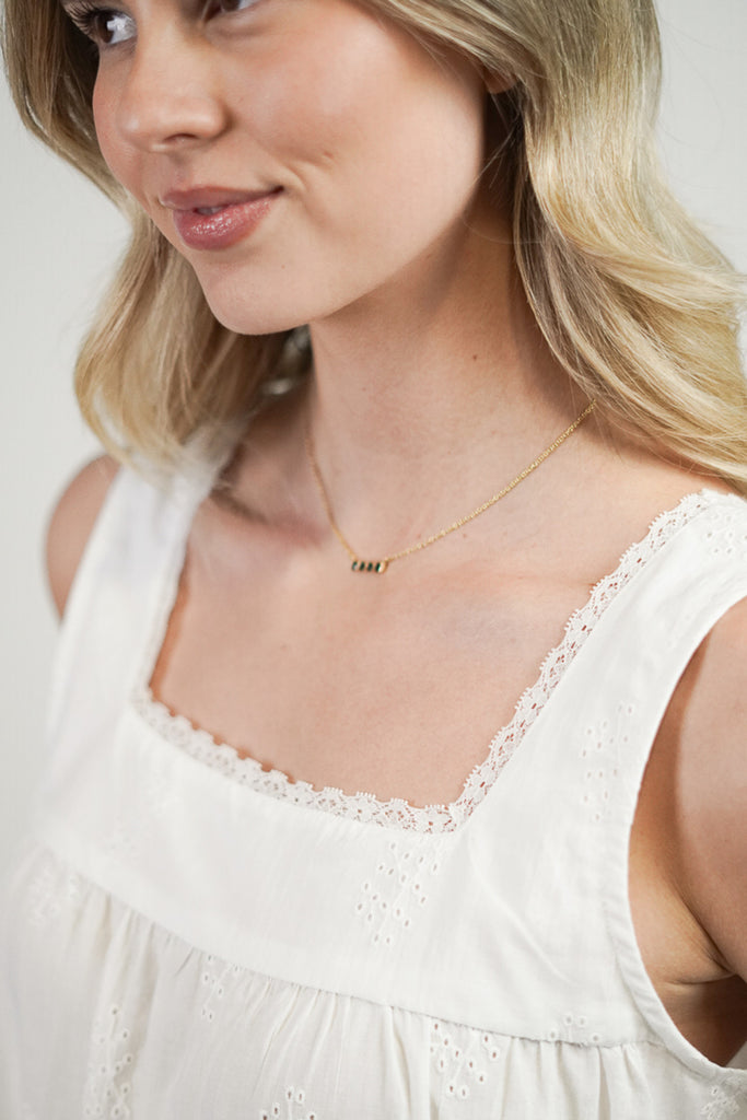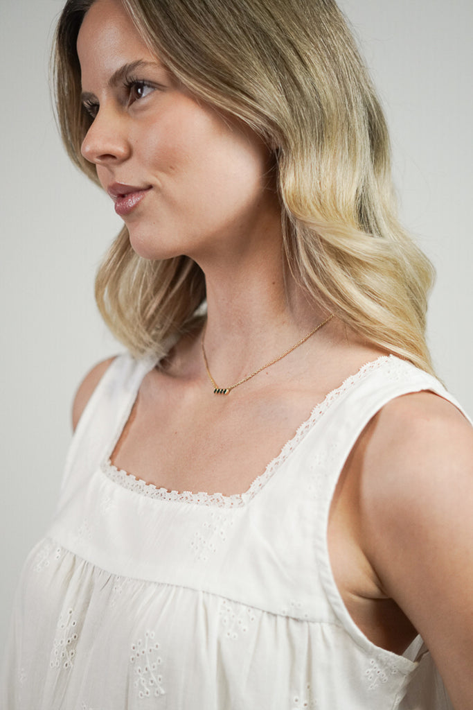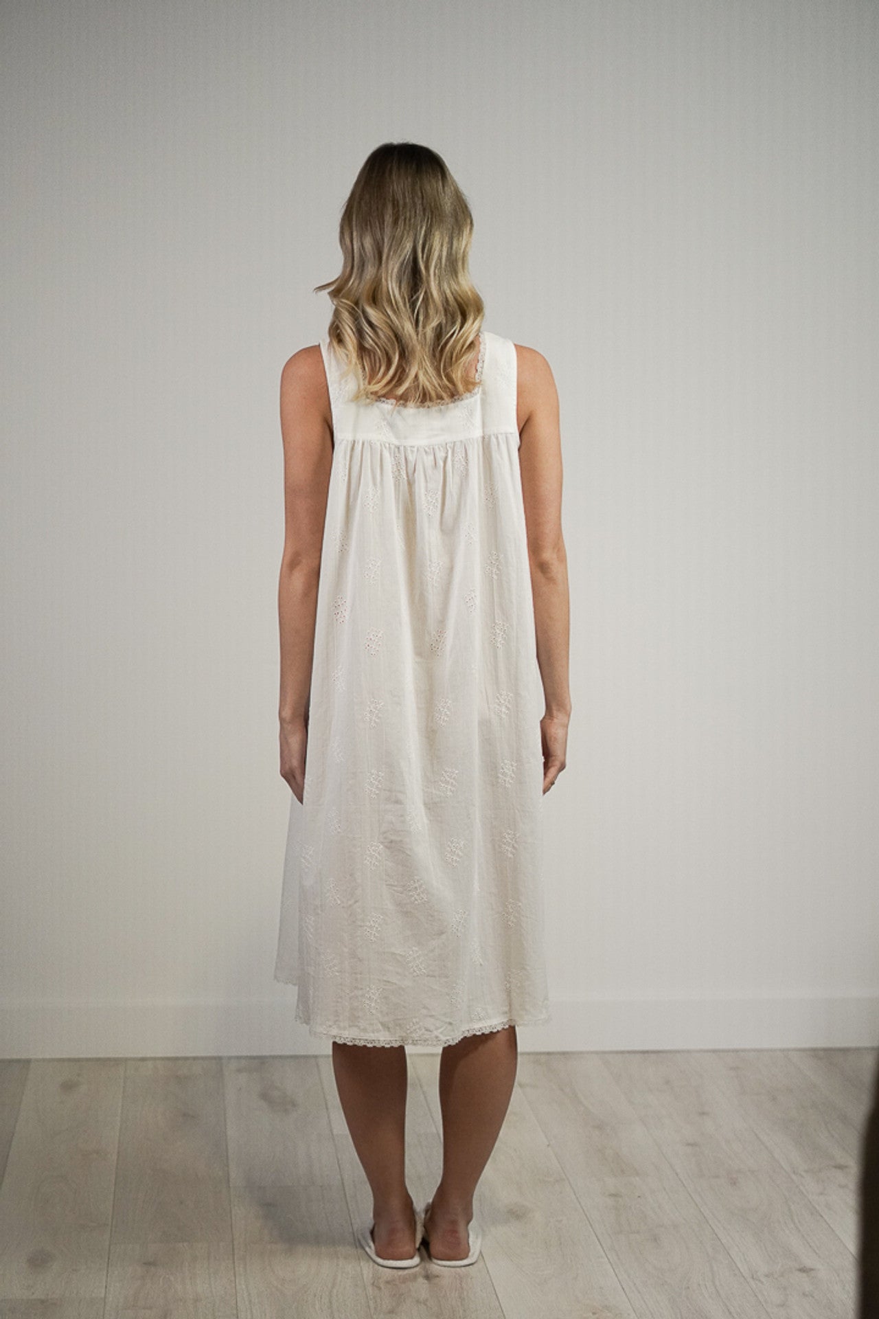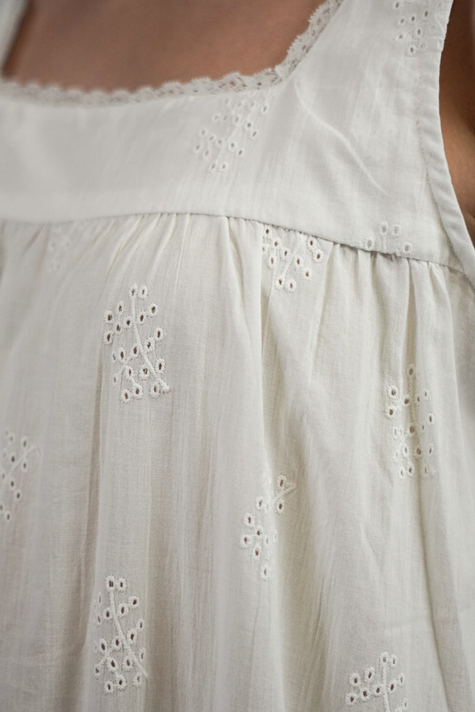Its breezy silhouette is elevated with intricate floral embroidery across the neckline and bodice.