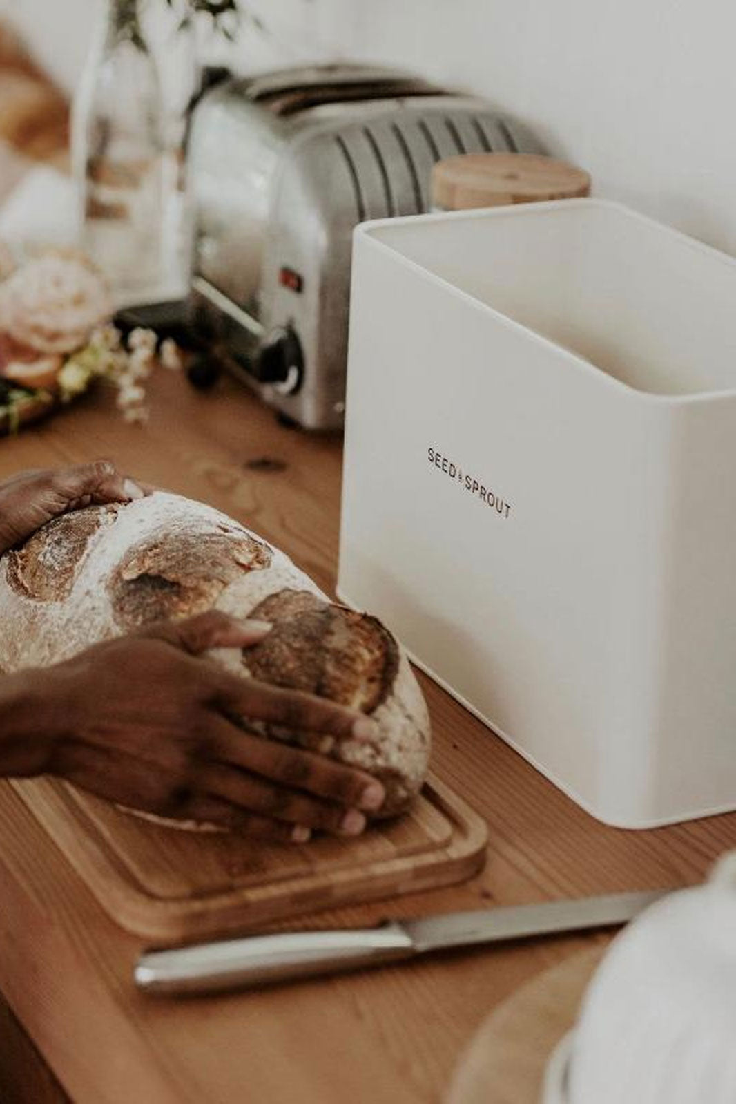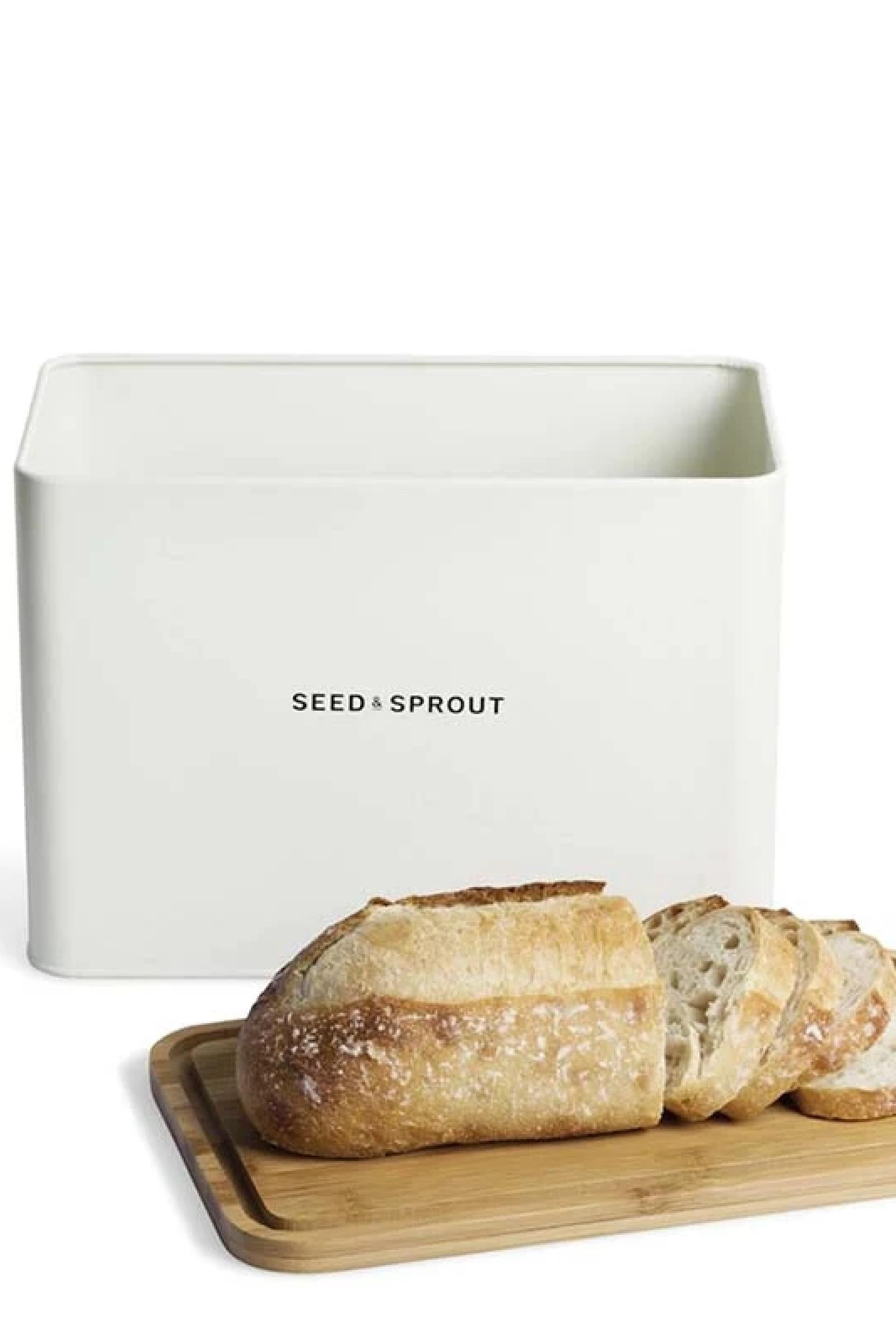 This Bread Box looks sleek on your kitchen counter & has enough room to store multiple loaves or any of your other baked goods. We love to put our loaves into the Seed & Sprout Linen Bread Bag before storing in the Bread Box to ensure it stays fresher for longer.