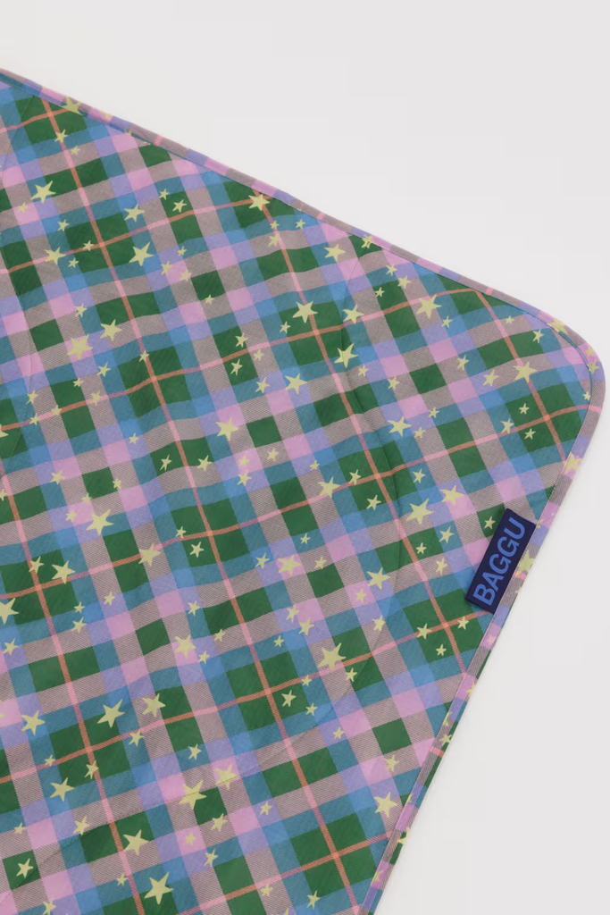 A quilted ripstop picnic blanket with carrying strap so you can roll it up and bring it anywhere.