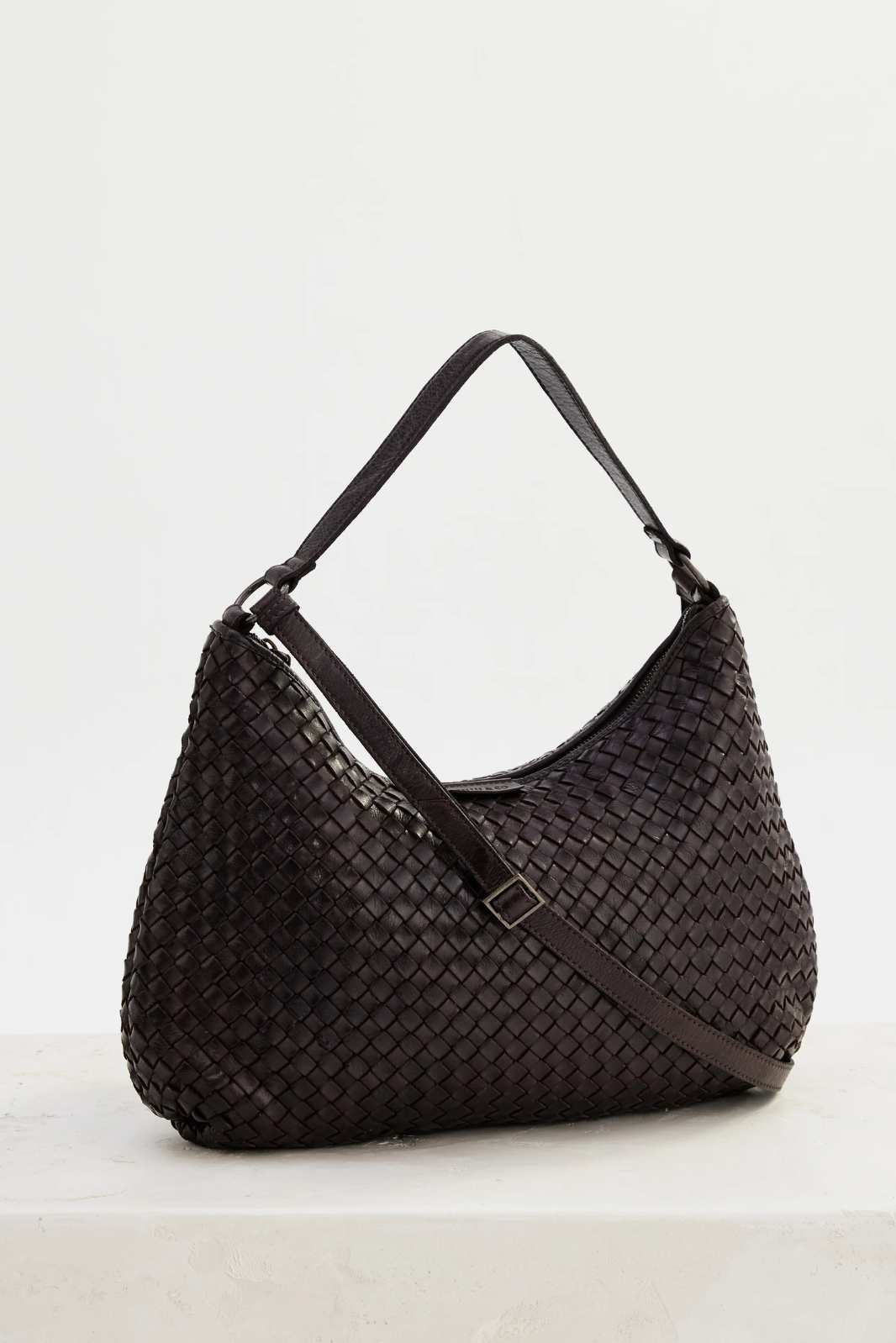 The Basque Slouchy is a shoulder bag made from woven leather. The Basque Slouchy fits a 13" laptop and is our take on wearable everyday luxury.