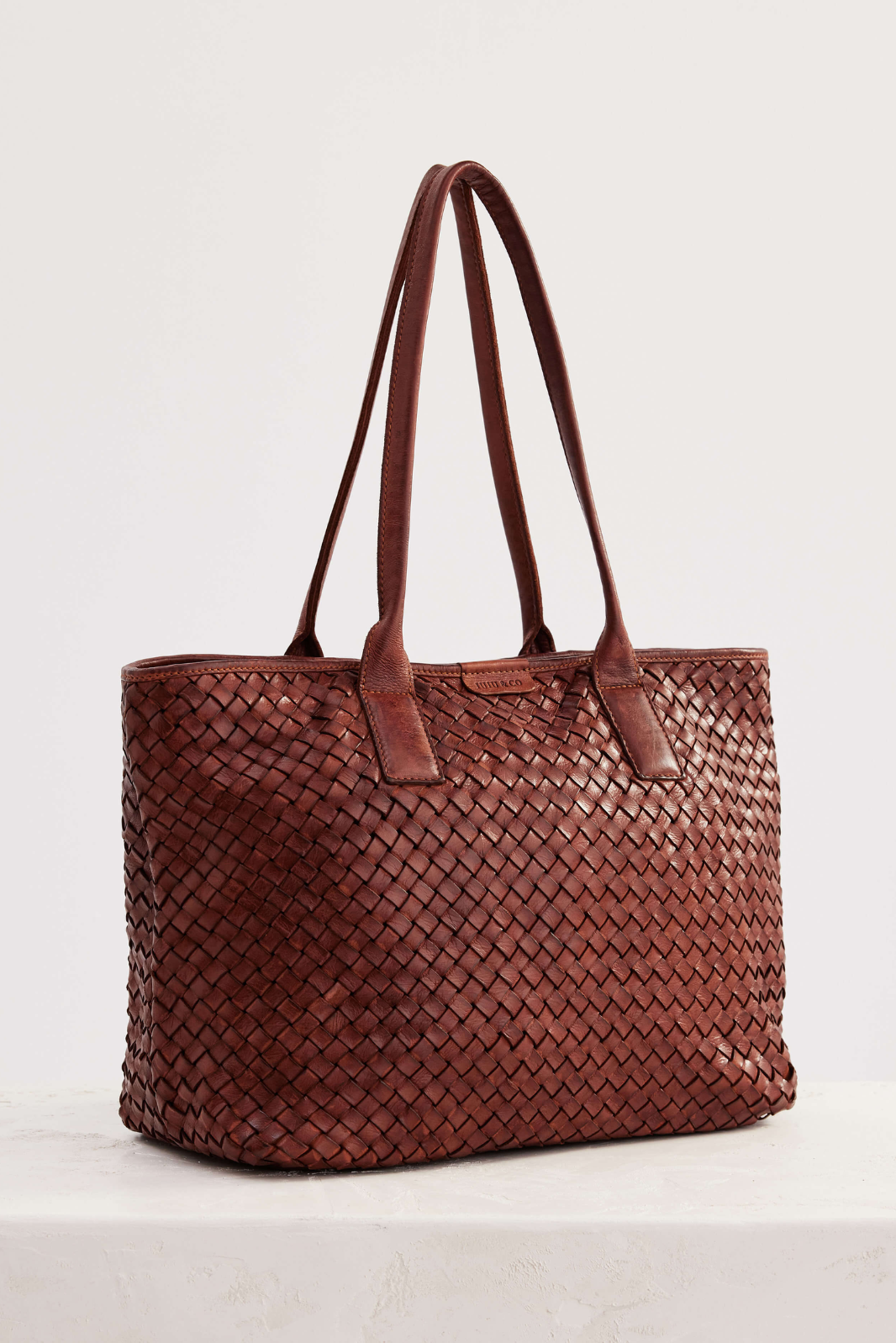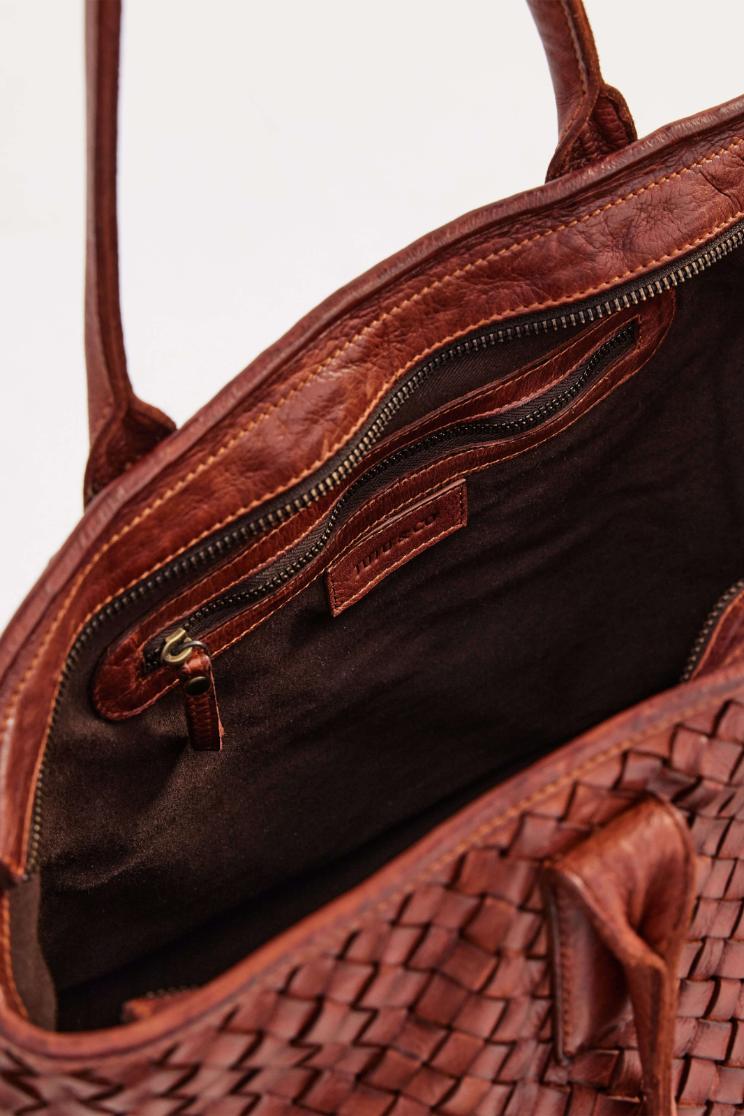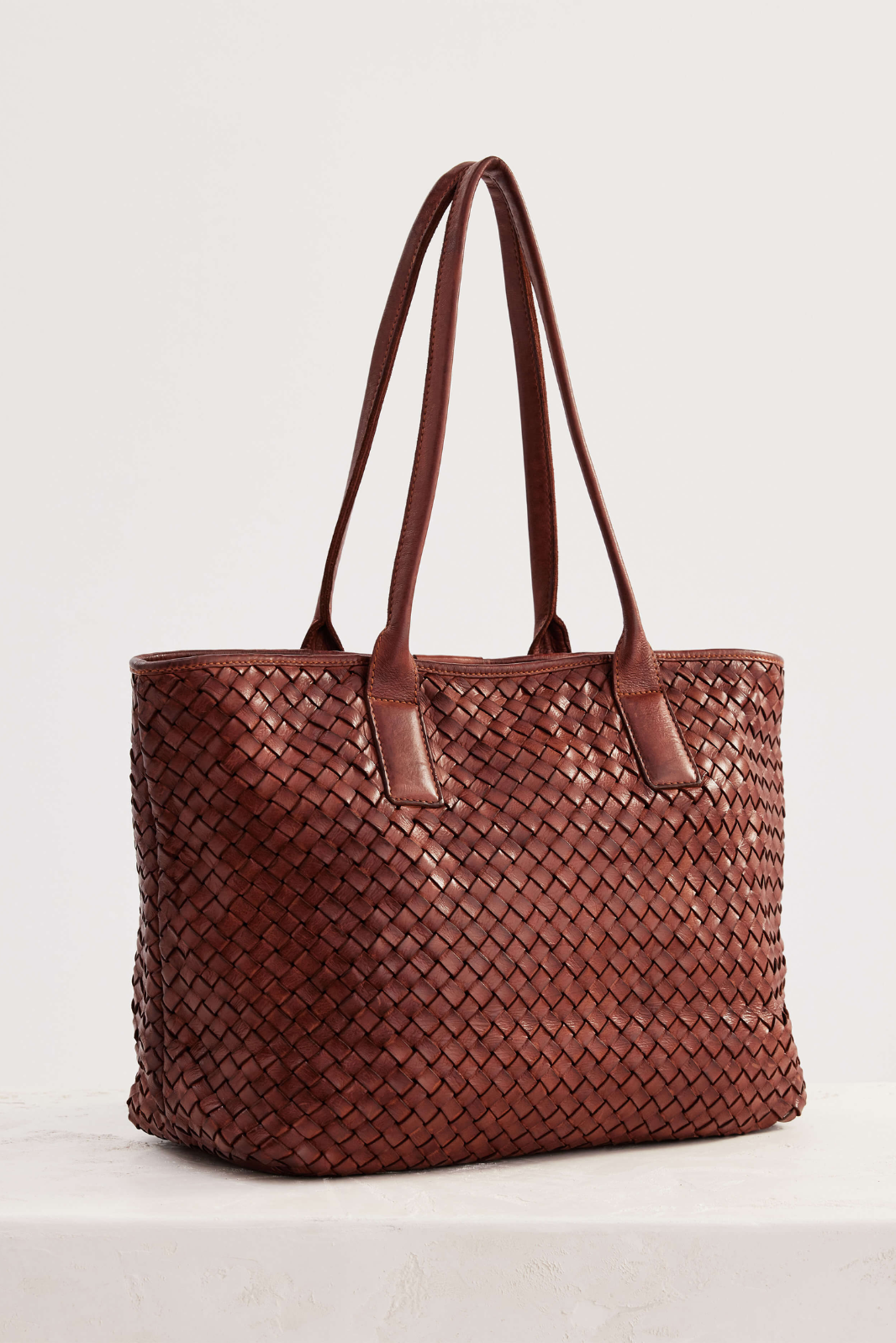 The Basque Tote in Amber is a large tote bag made from light brown woven leather. This tote is the ultimate work bag, with ample space for a laptop, and a top zip closure to keep your things secure.