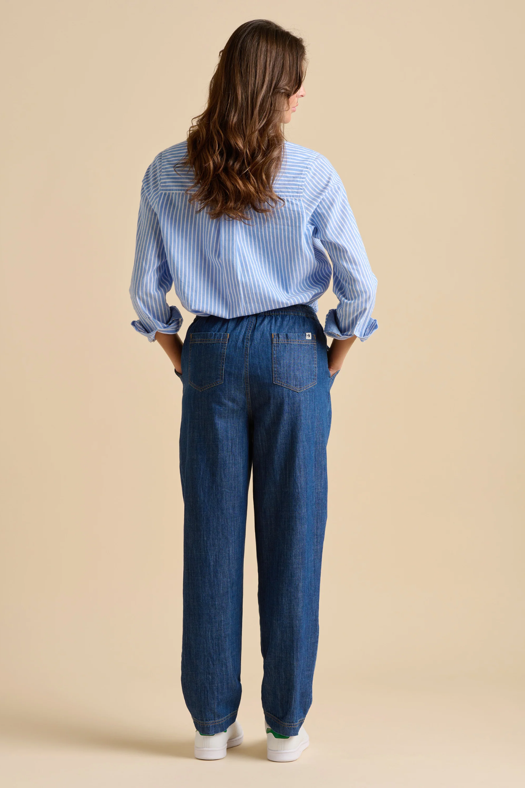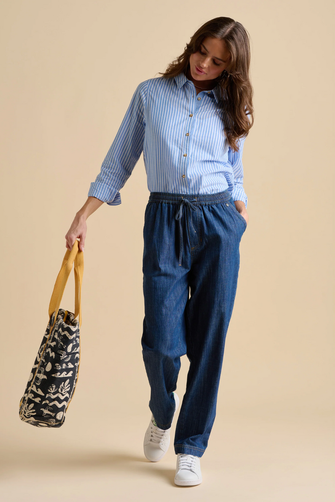 A wardrobe staple for the warmer seasons. With an elasticated waistband and brown thread details that contrast the blue beautifully, these trousers are the comfiest pair of jeans you’ll ever own. They’ll pair with anything and are perfect for any casual occasion!