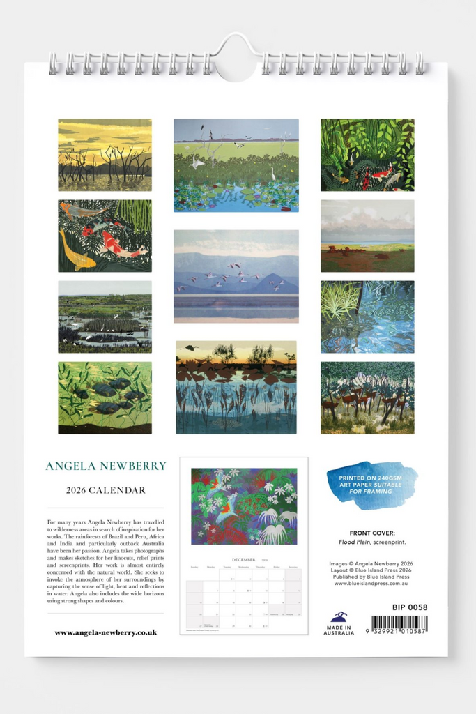 For many years Angela Newberry has travelled to wilderness areas in search of inspiration for her works. The rainforests of Brazil and Peru, Africa and India and particularly outback Australia have been her passion. Angela takes photographs and makes sketches for her linocuts, relief prints and screenprints. Her work is almost entirely concerned with the natural world. She seeks to invoke the atmosphere of her surroundings by capturing the sense of light, heat and reflections in water. Angela also includes the wide horizons using strong shapes and colours.