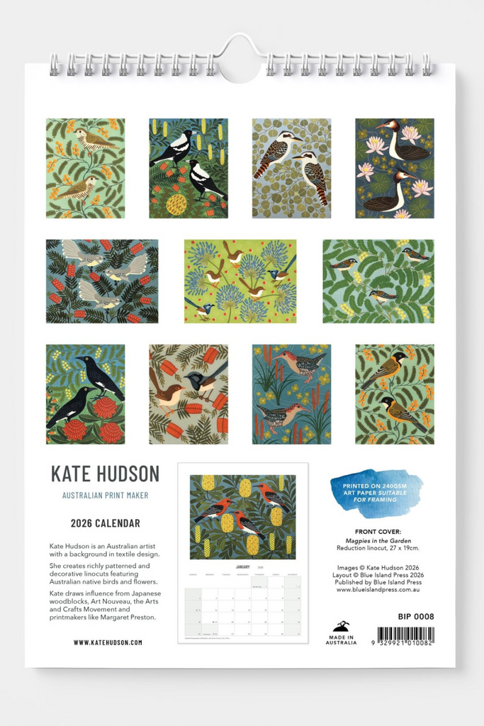 Kate Hudson is an Australian artist with a background in textile design, who makes richly patterned and decorative linocuts of native birds and flowers. She draws influence from Japanese woodblocks, Art Nouveau, the Arts and Crafts Movement and printmakers like Margaret Preston.
