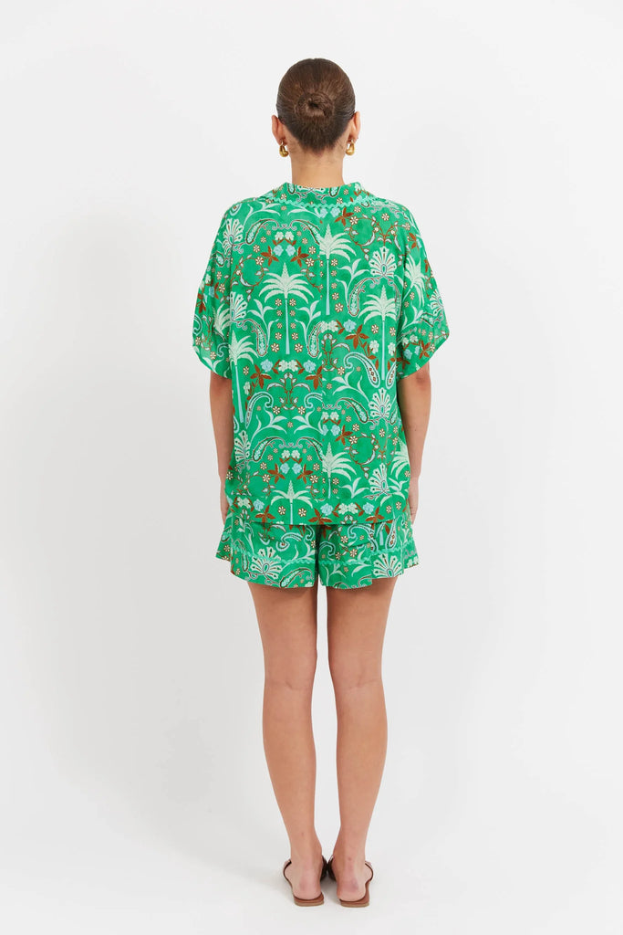 The Haiti Shirt is crafted from a breathable rayon and features a relaxed, hip-skimming shape with short wide sleeves for an effortless fit. Featuring a collared neckline, mother-of-pearl buttons and playful ric-rac trim detailing.