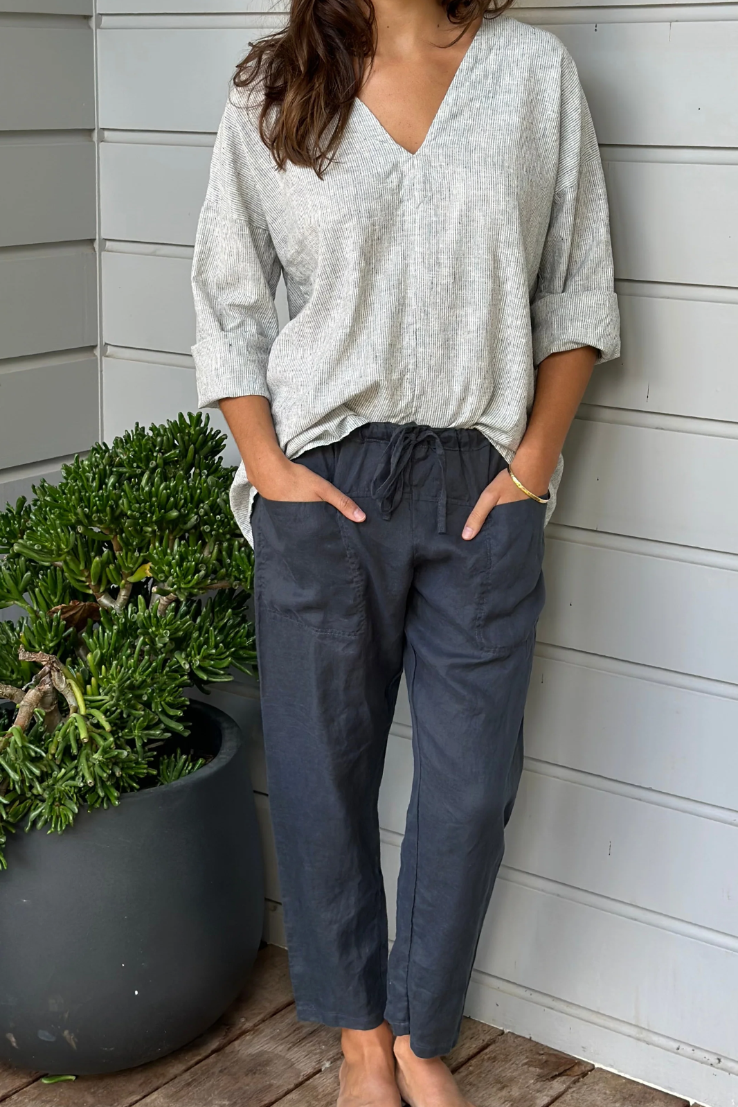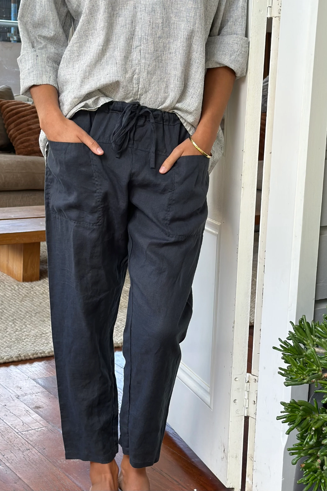 4/5 length with an elasticised drawstring waist and 2 front pockets