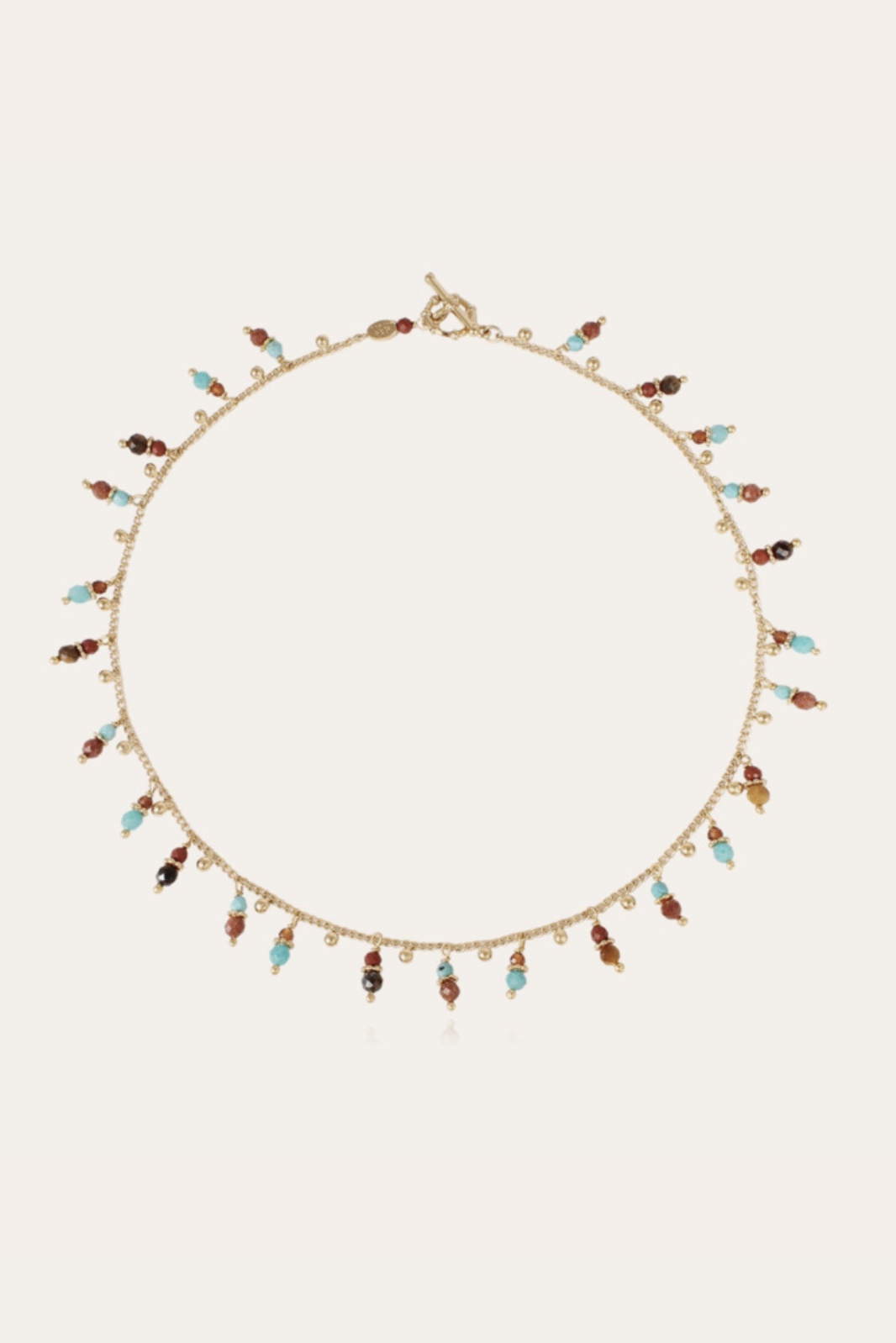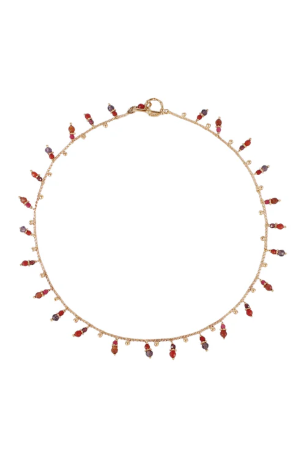 Gold plated necklace adorned with delicate gemstones.