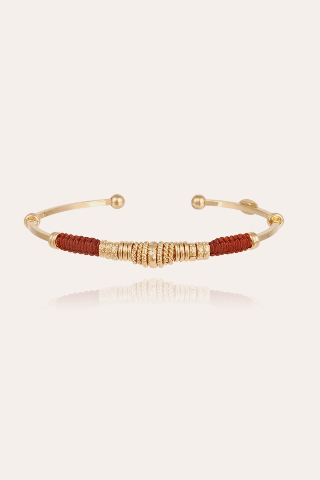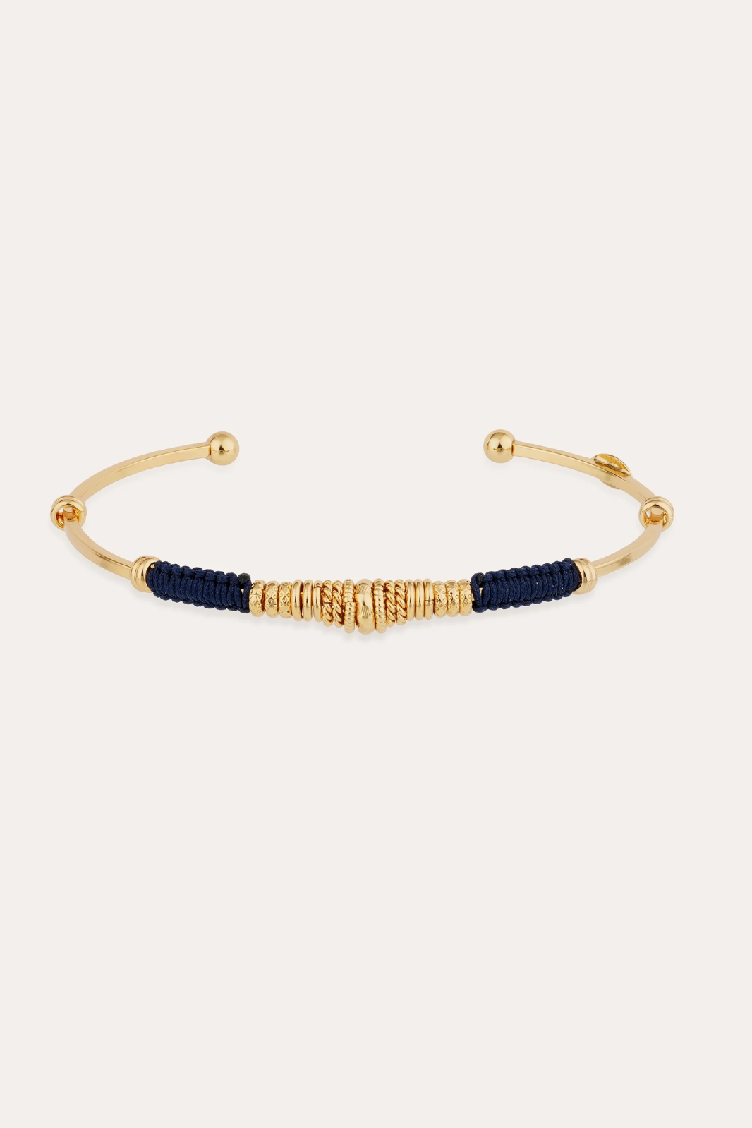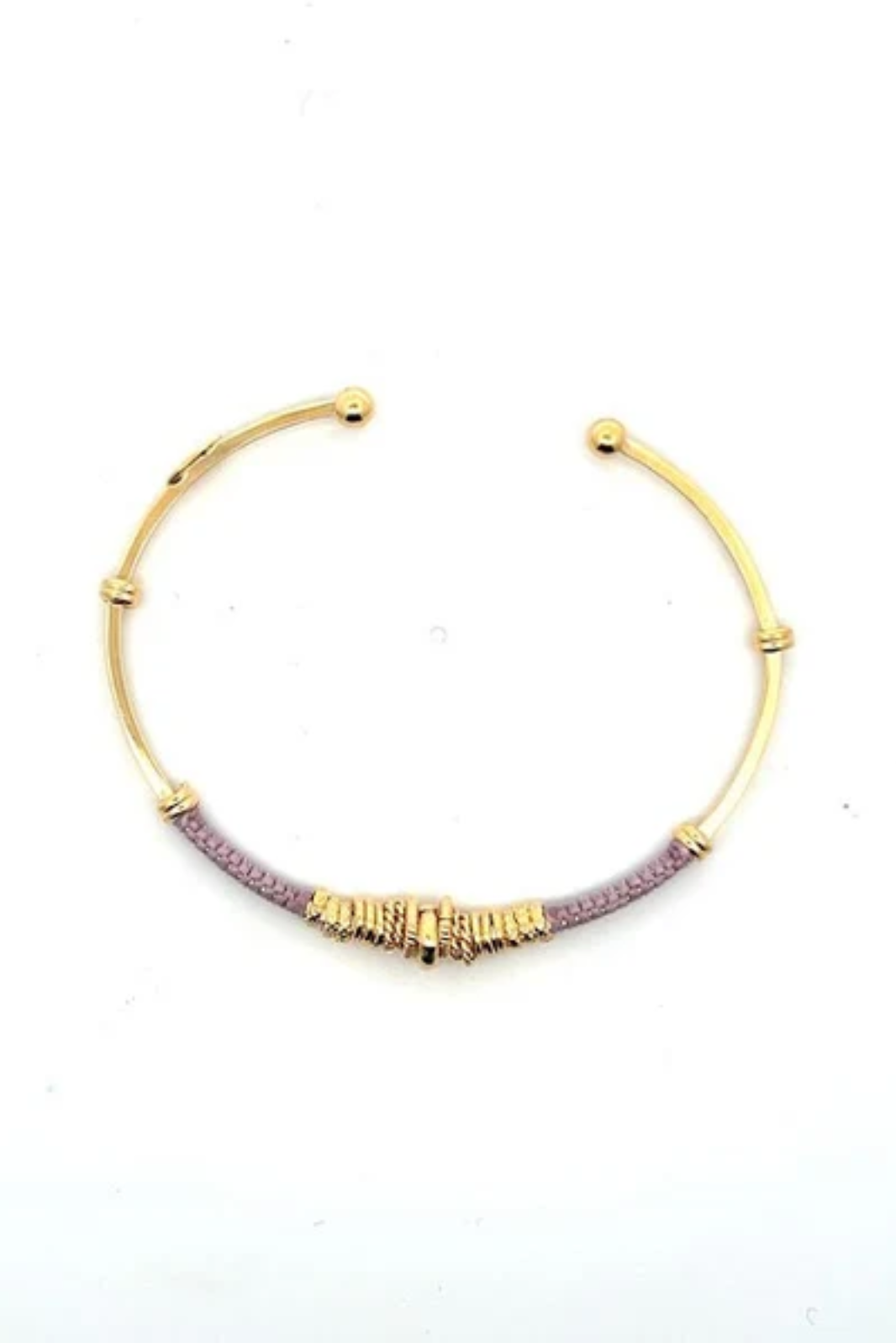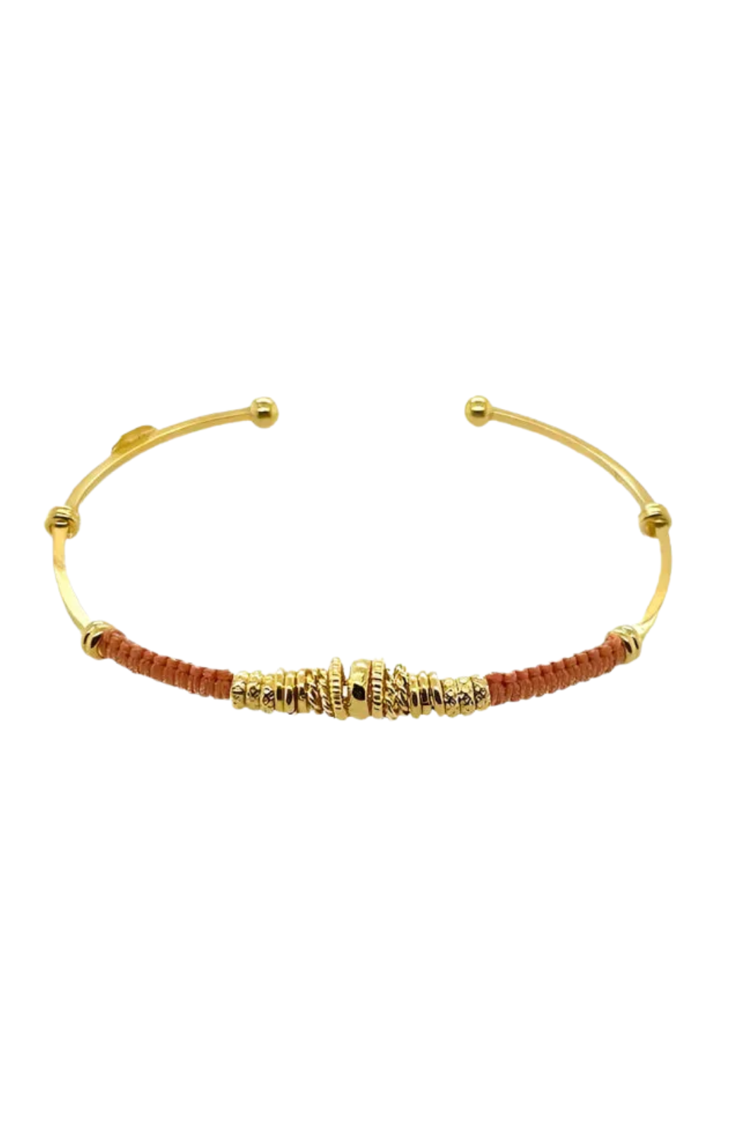 Gold plated bangle, wrapped in part by cotton threads and golden plated adornments.