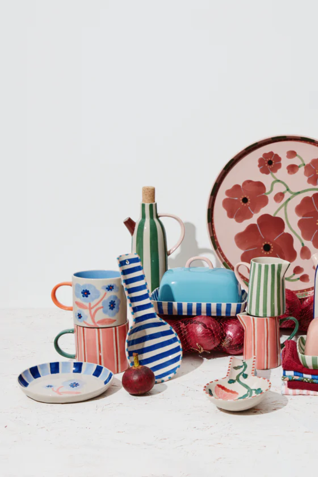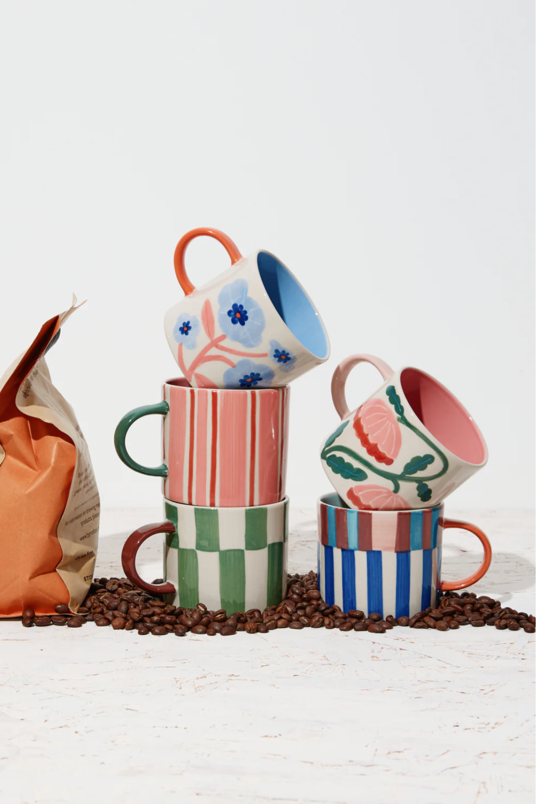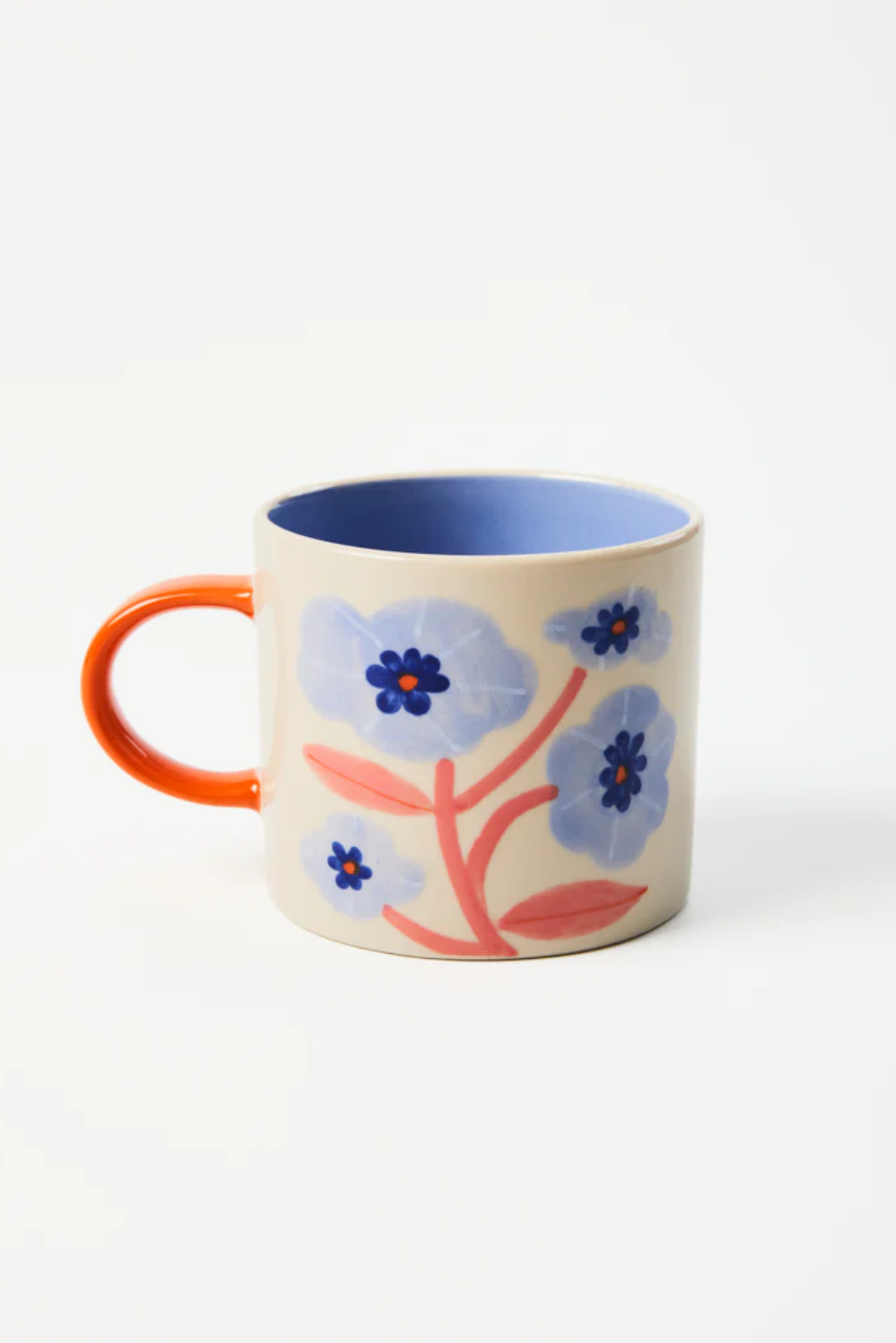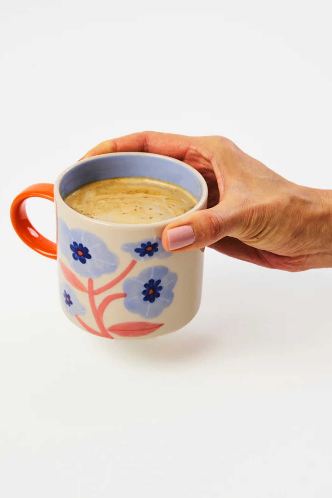 A little garden moment in your hands. The blue flower mug is handpainted with scattered blooms in cobalt, coral and pale blue. Joyful, practical and perfect for gifting.