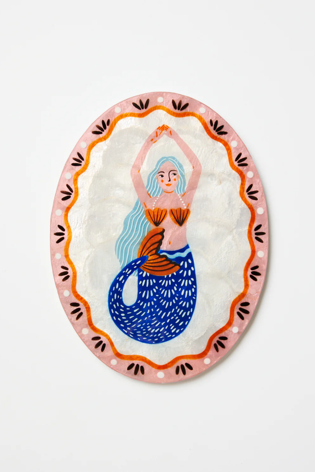 Luminous Capiz shell meets artisanal brushwork in our Mermaid Pearl Fan Tile, where seafaring dreams soar on your wall. This pink and orange bordered oval showcases a flowing-haired mermaid with shimmering blue and white scales that captures both light and imagination. The subtle variations in shell opacity and painted technique transform ordinary walls into enchanting underwater narratives a statement piece that brings unexpected joy..