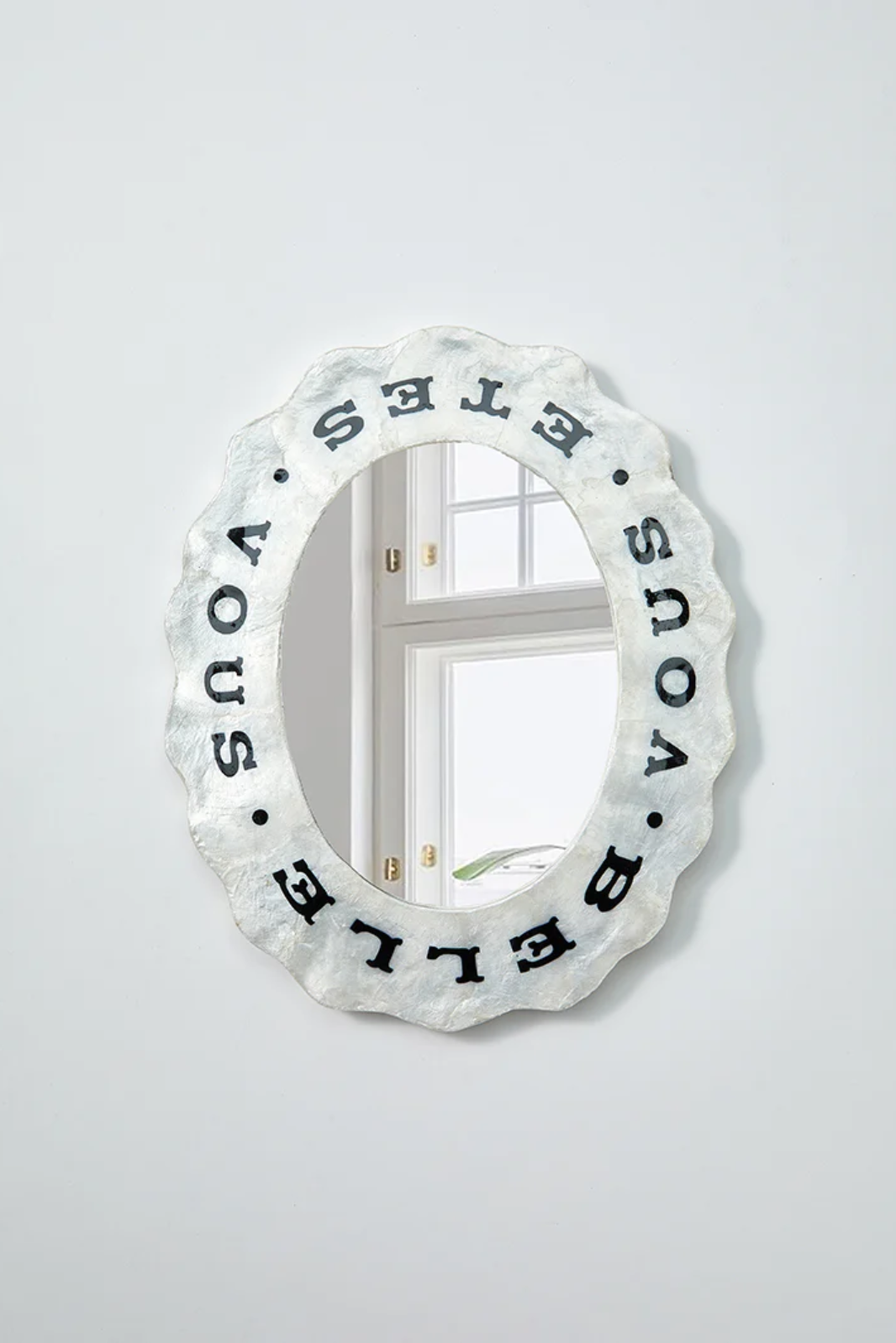 Embrace your inner beauty with our You Are Beautiful mirror! Crafted with care from lustrous capiz shell, a native treasure of the Philippines, this oval mirror is a daily reminder that beauty resides both inside and out. With striking black lettering on a natural white background, every glance becomes a moment of self-celebration. Because, darling, you truly are magnifique!