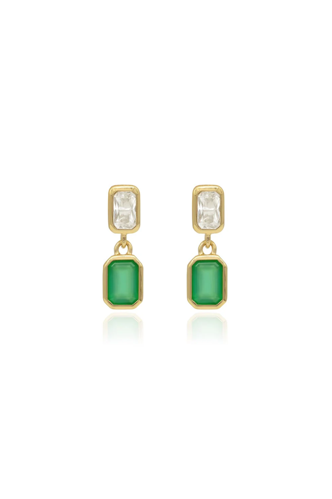 The Gemme Calibri Drop Earrings feature a green onyx & lab-grown white sapphire.