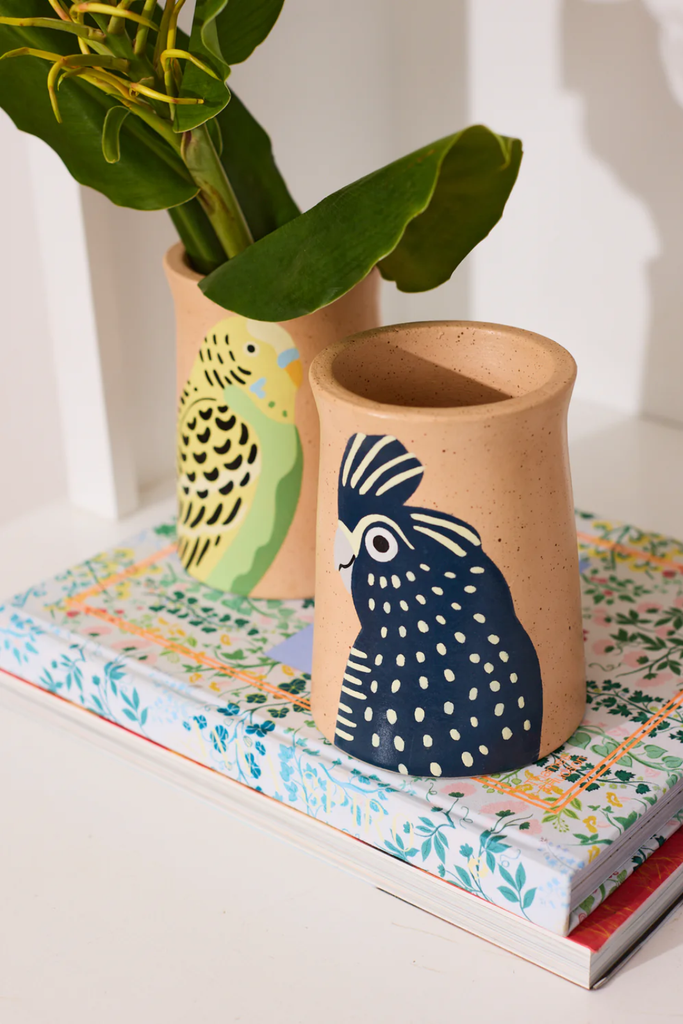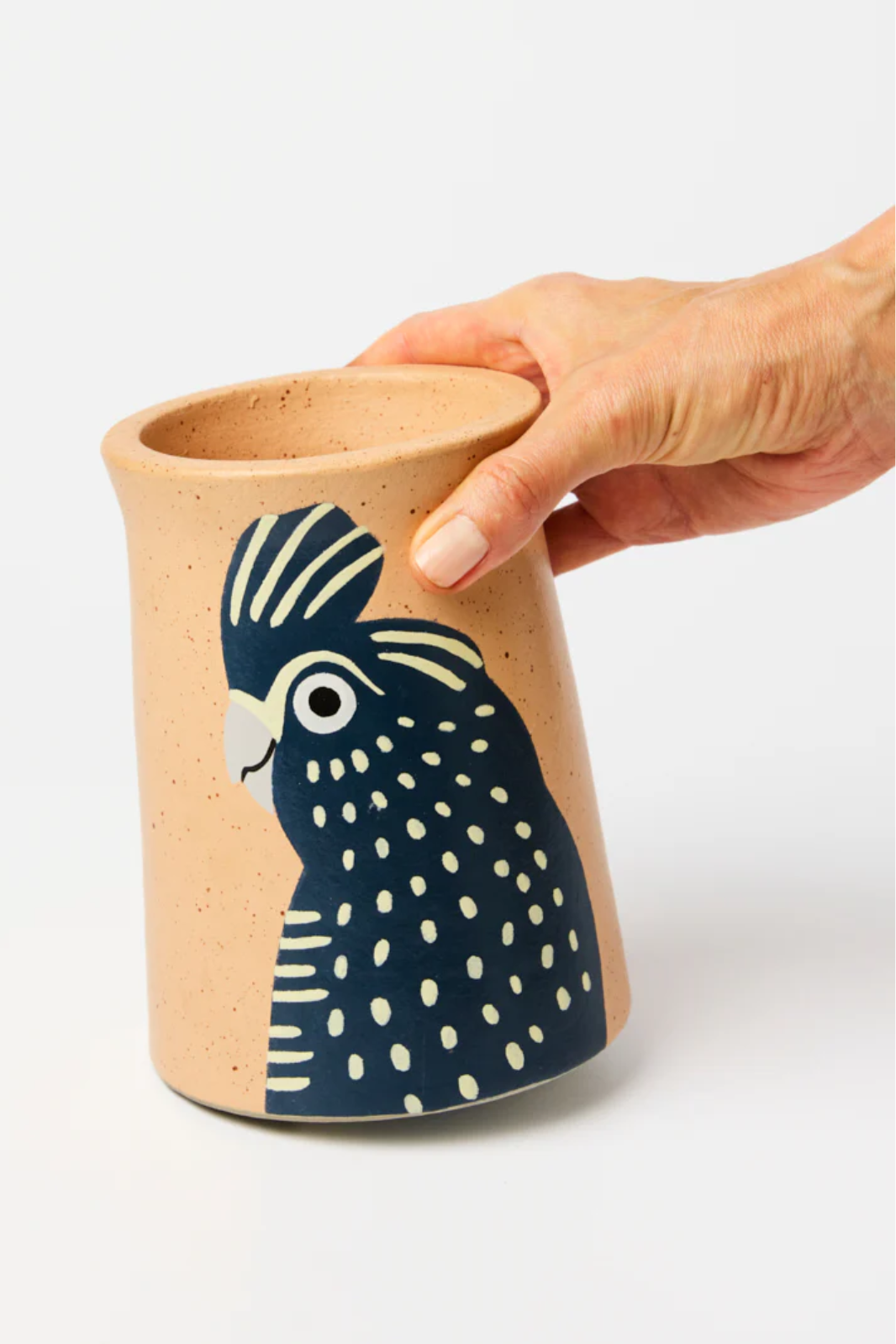 The Black Cockatoo vase transforms humble speckled terracotta into a celebration of Australia's most majestic native bird. Hand-painted with deep plumage and distinctive white spotting, this wheel-thrown vessel has folk-art freedom in the illustration. The cockatoo's expressive crest and watchful eye emerge from the clay with personality and presence bringing the dignified energy of these endangered creatures into your home while creating a perfect vessel for botanical finds.