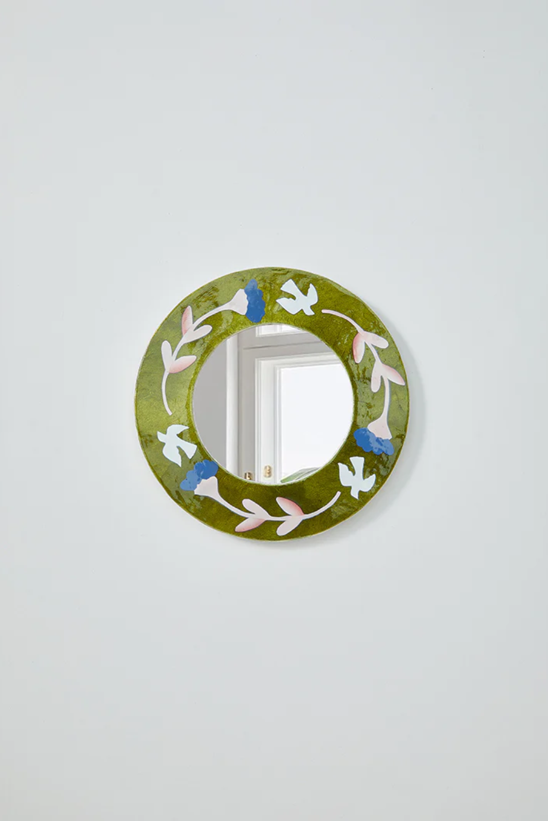 The Francois Vert capiz shell mirror; This round mirror brings a touch of sweet serenity to your decor, featuring floral and bird motifs hand-painted on a calming green background. Crafted from capiz shell, a distinctive material from the Philippines, it infuses artisanal elegance into your space. Whether in your living room, bedroom, or as part of a charming French-style gallery wall.
