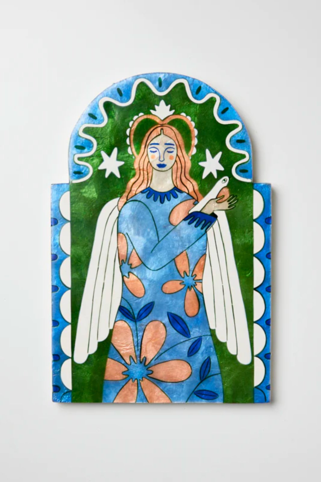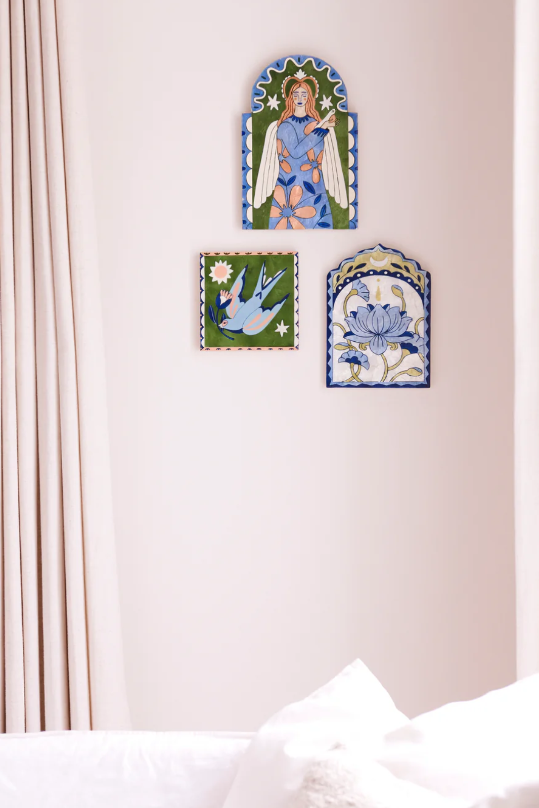 Add a touch of serenity to your space with this charming Gardienne Angel Green arch wall art tile featuring a peaceful guardian angel holding a dove in a beautiful folk style. Hand-painted with care, it adds a sweet and calming touch to any room. Whether hung alone or as part of a collection, this wall art tile is sure to be a much-loved addition to your home and create a calm and serene vibe. We love this hung next to the bed or on the mantel piece