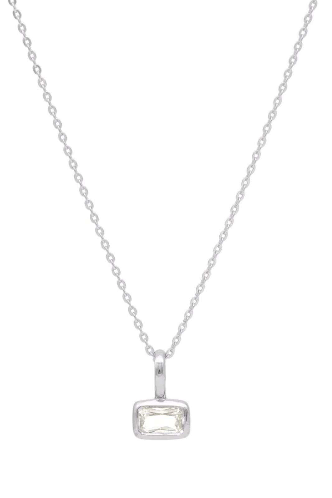 Featuring an emerald cut lab-grown white sapphire in a bezel setting.