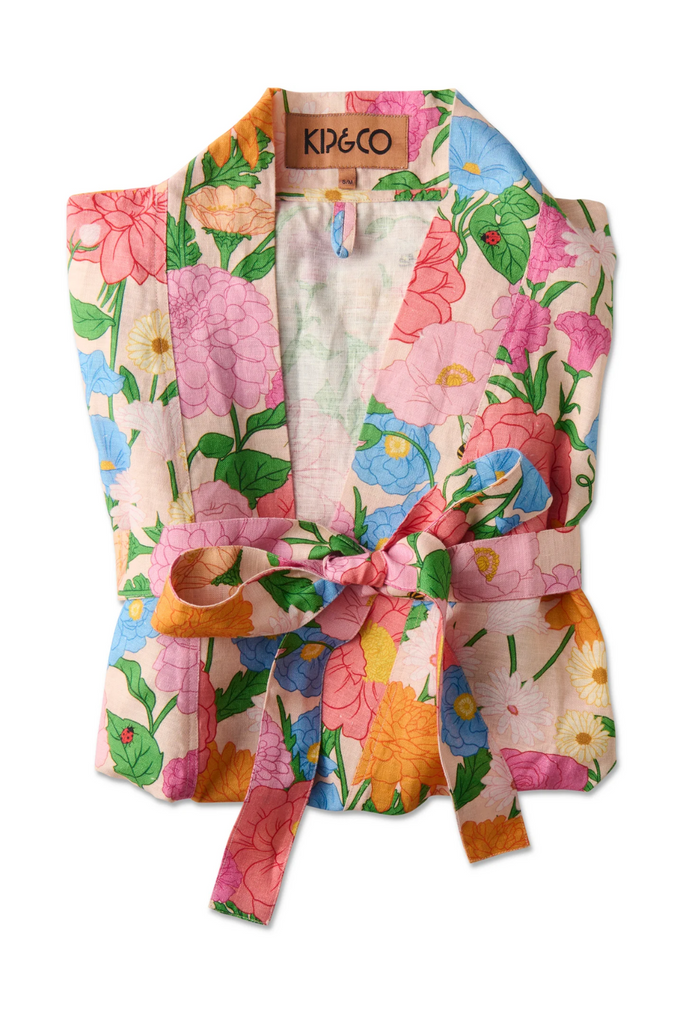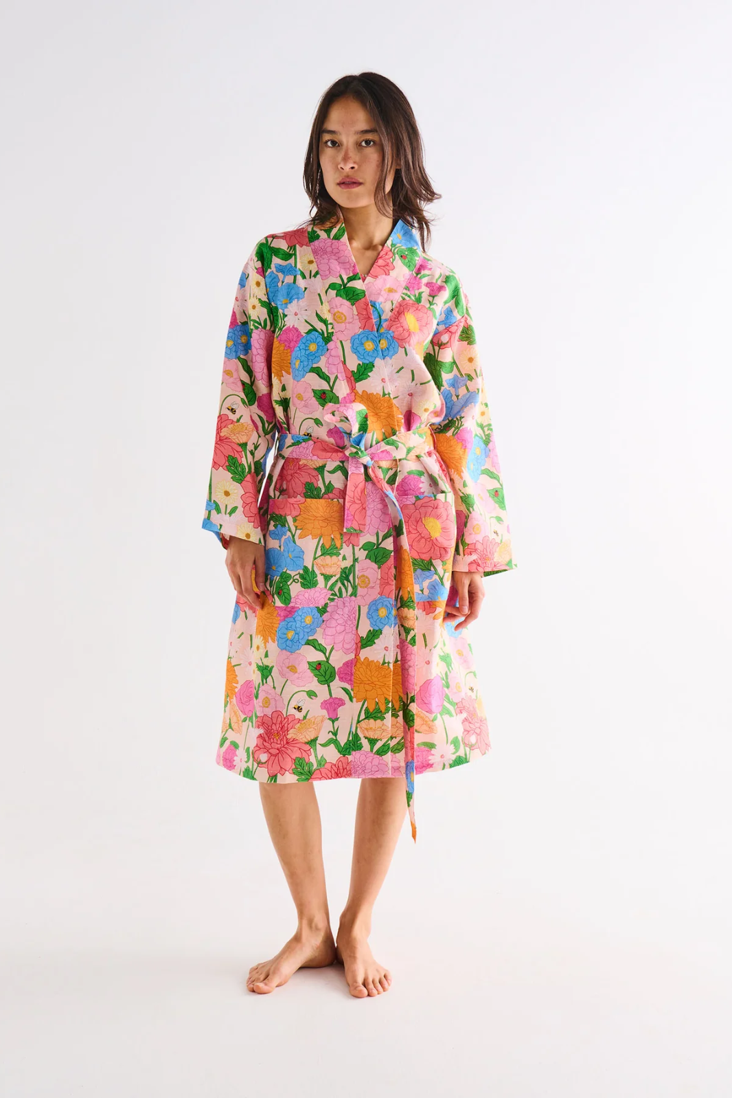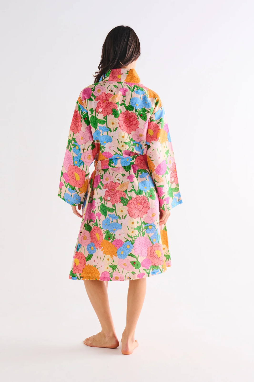 Slip into something comfy with the Follow The Sun Linen Robe. Crafted from breathable, airy linen, it’s the perfect companion for slow mornings, post-swim lounging, or relaxed summer evenings. Lightweight, and effortlessly chic, this robe brings a splash of summer ease to your everyday - the ultimate in laid-back luxury, Kip&Co style. The Follow The Sun print is blooming with hand-drawn florals in shades of pink, orange and cornflower blue, dotted with friendly little bees and lady beetles on a light pink base.