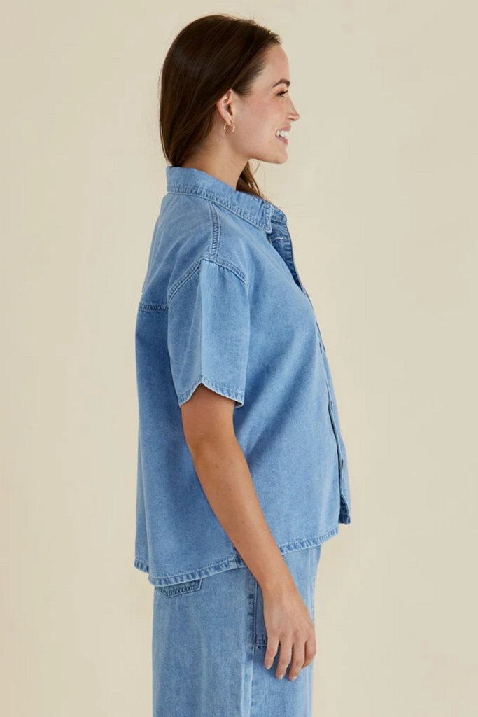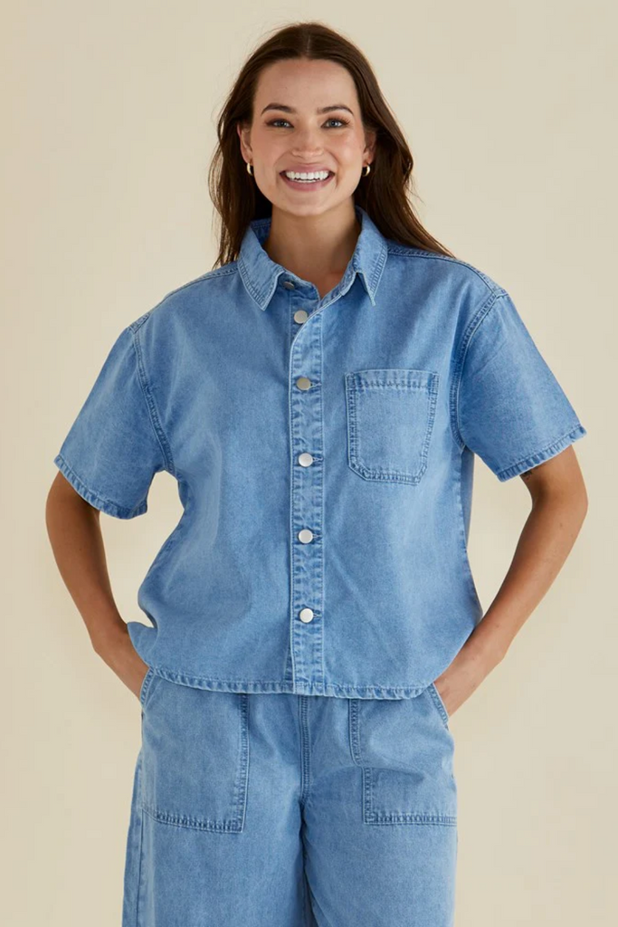 Betty Basics Saffra Short Sleeve Denim Shirt - Medium Wash Blue Denim