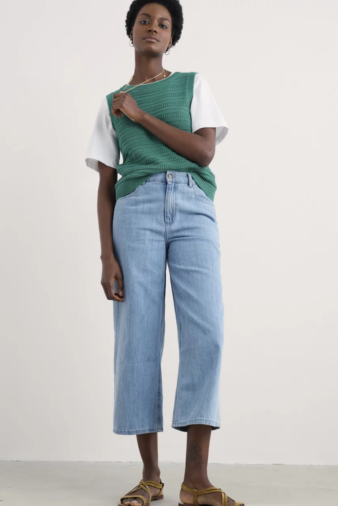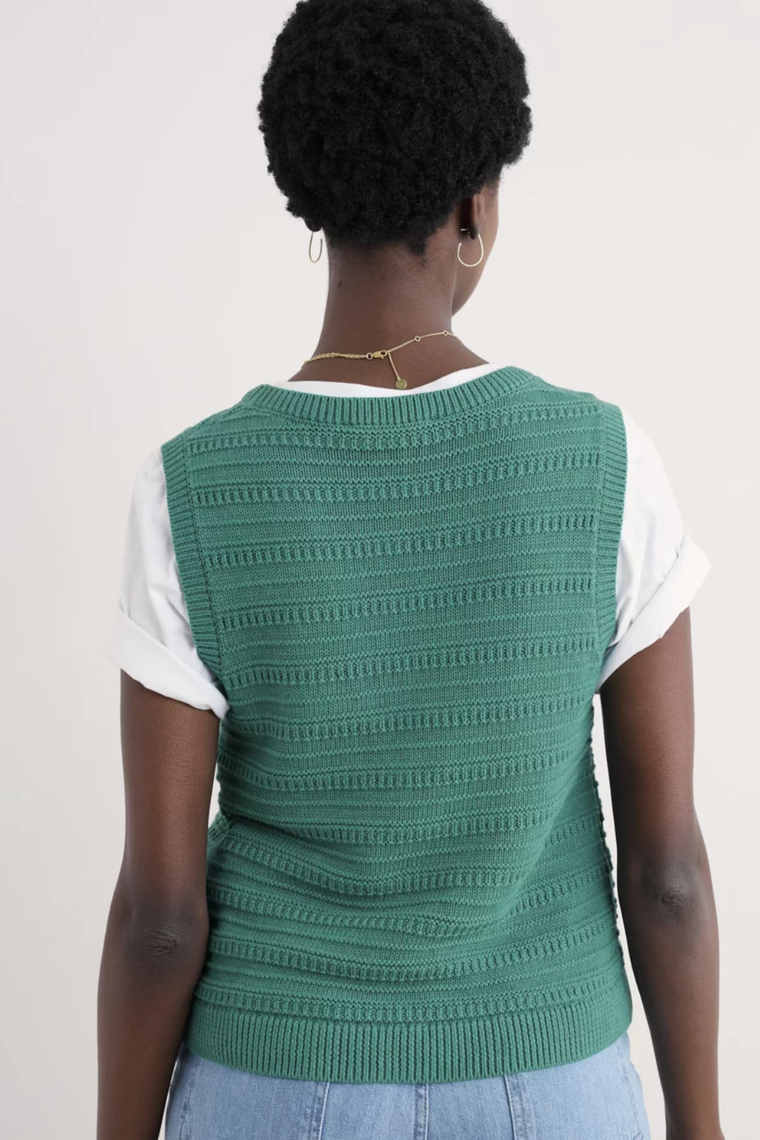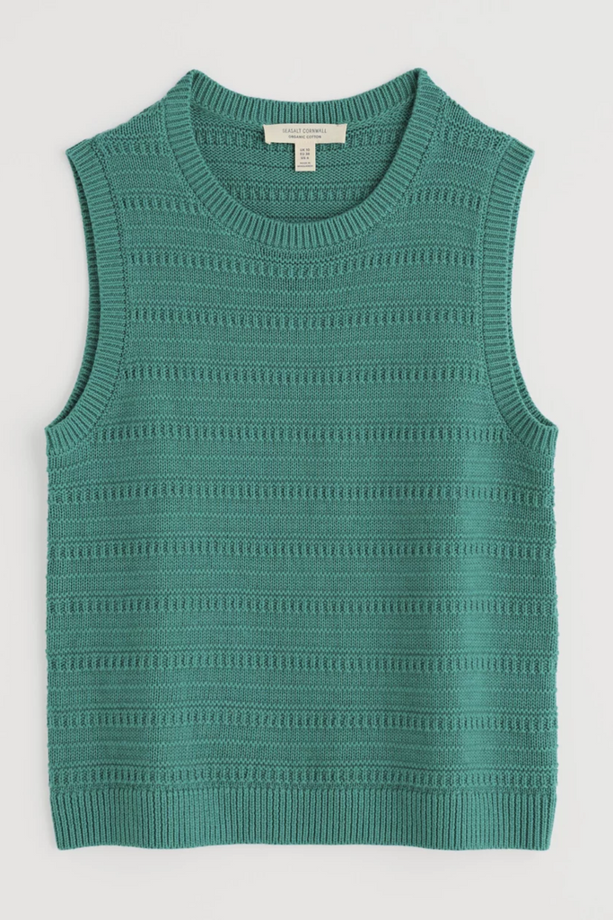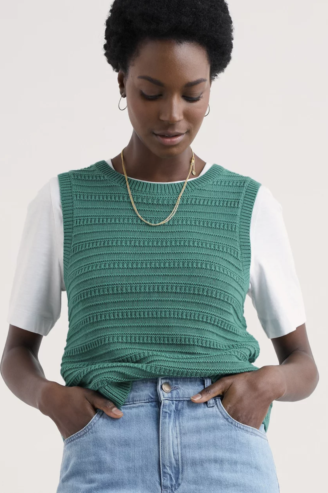 A mid weight round-neck knitted vest in soft, breathable organic cotton with a horizontal ribbed stitch pattern and ribbed edges. Designed to last through the seasons, it can be worn with and without a layer underneath. We love it over dresses or shirts, or worn alone with comfy jeans.