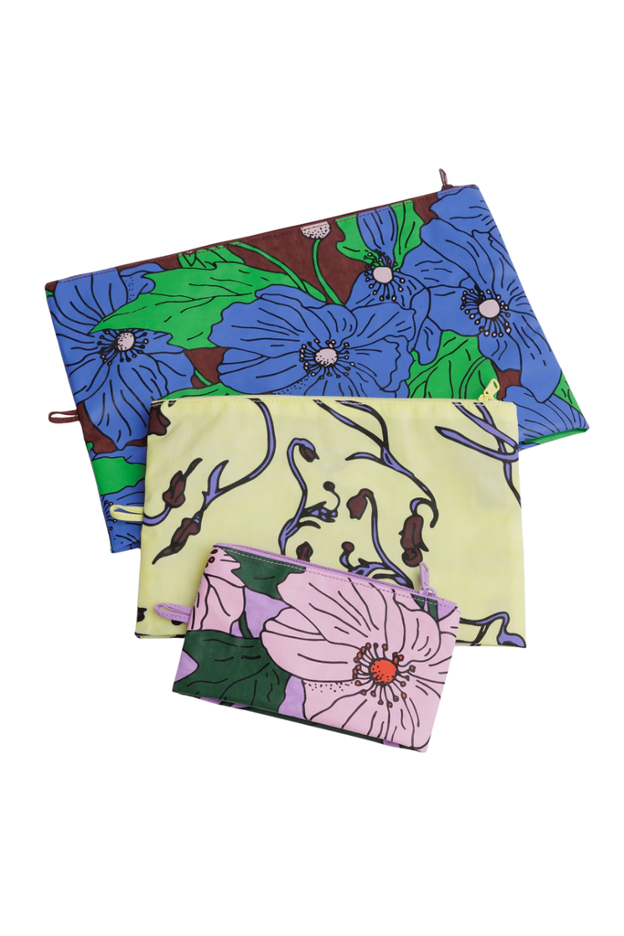 The Go Pouch Set makes it easy to keep your bag neatly packed and organised. Whatever you're toting—coins, cords, or an extra pair of shoes—this set of three all purpose pouches keeps it together. They expand to hold your essentials and lay flat when not in use.