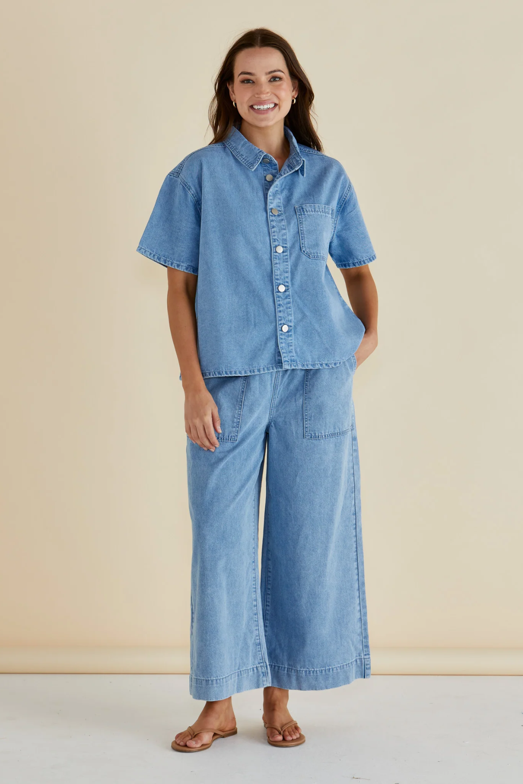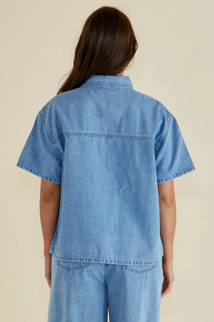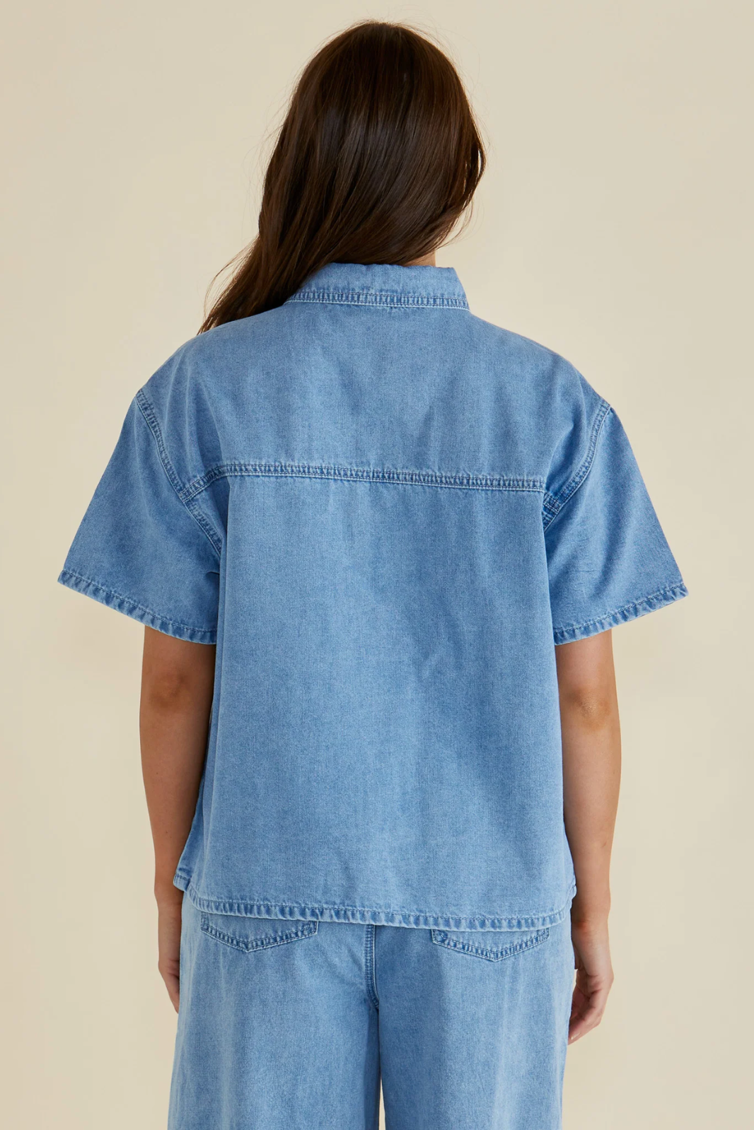 Betty Basics Saffra Short Sleeve Denim Shirt - Medium Wash Blue Denim