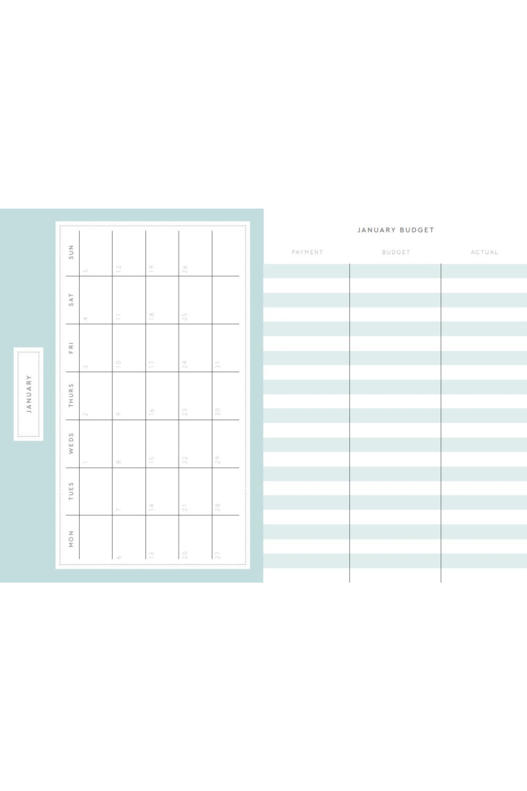 - Year to view, monthly planner, monthly "things of importance" page, monthly budget