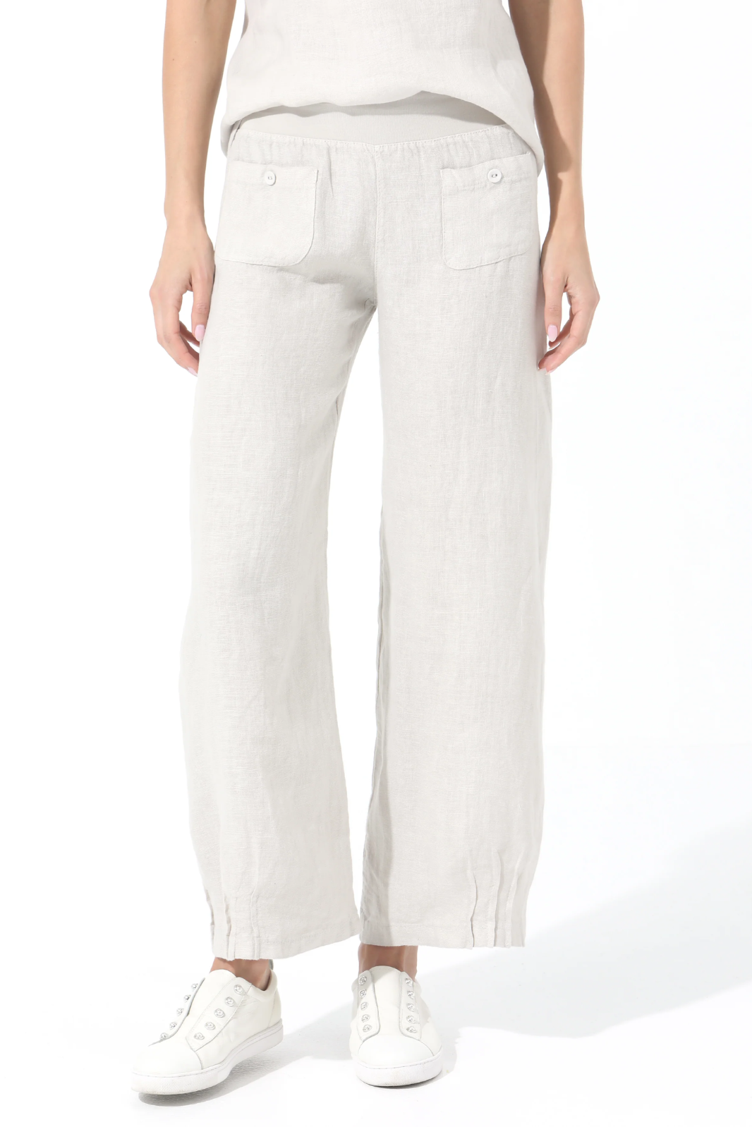 Full length linen pant with stretch waistband, pleated hem, and external front pockets with self-covered buttons.