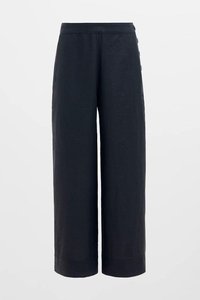 The Hersom Pant is a high waisted, straight legged design crafted from 100% French linen. This lightweight piece has been designed with a left side button and tab closure detailing, faux back welt pockets and a wide cuff that allows for versatile styling. Roll at the cuff and pair with sneakers for a relaxed, casual style or dress up with platform sandals for a contemporary look.