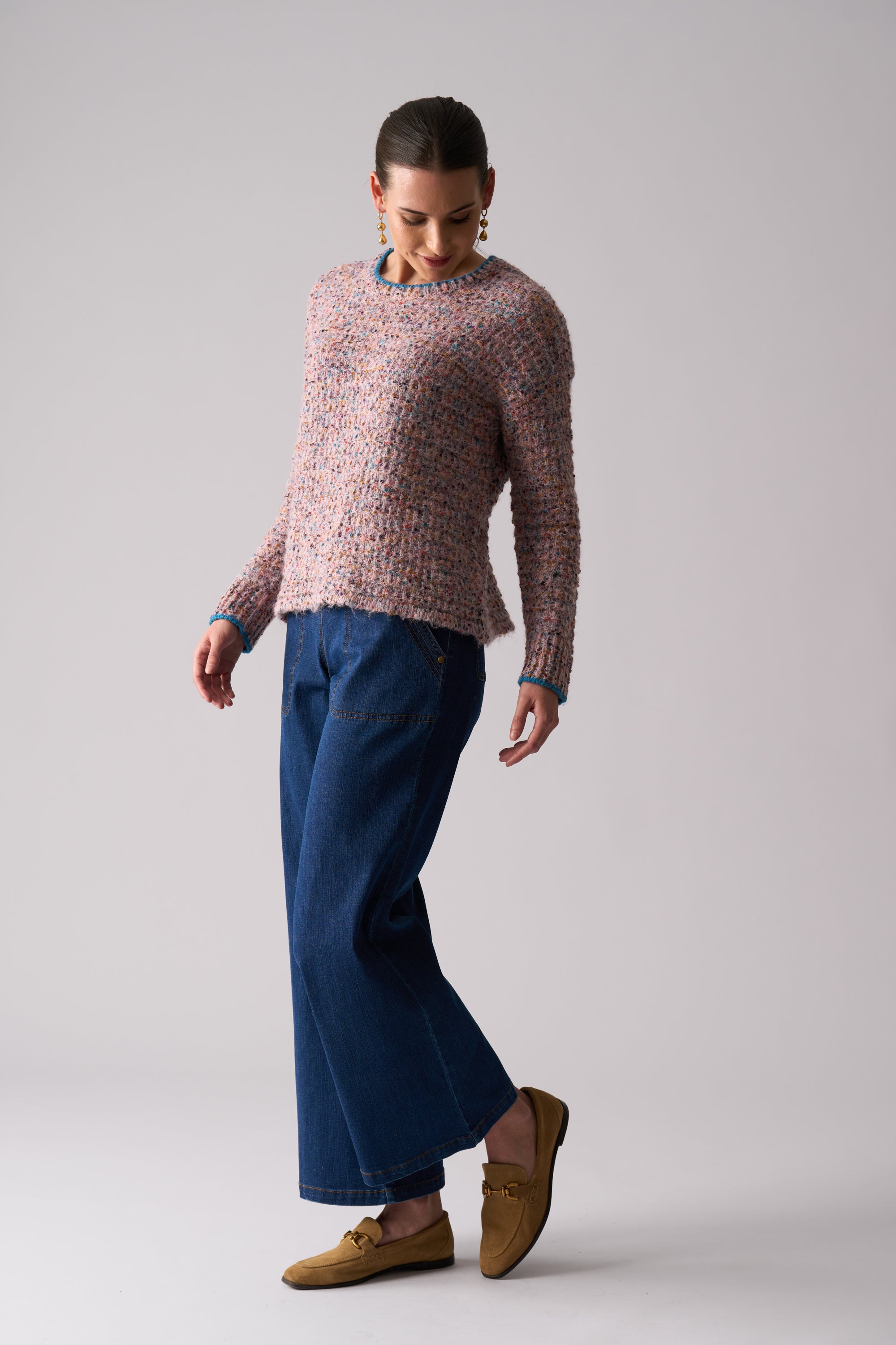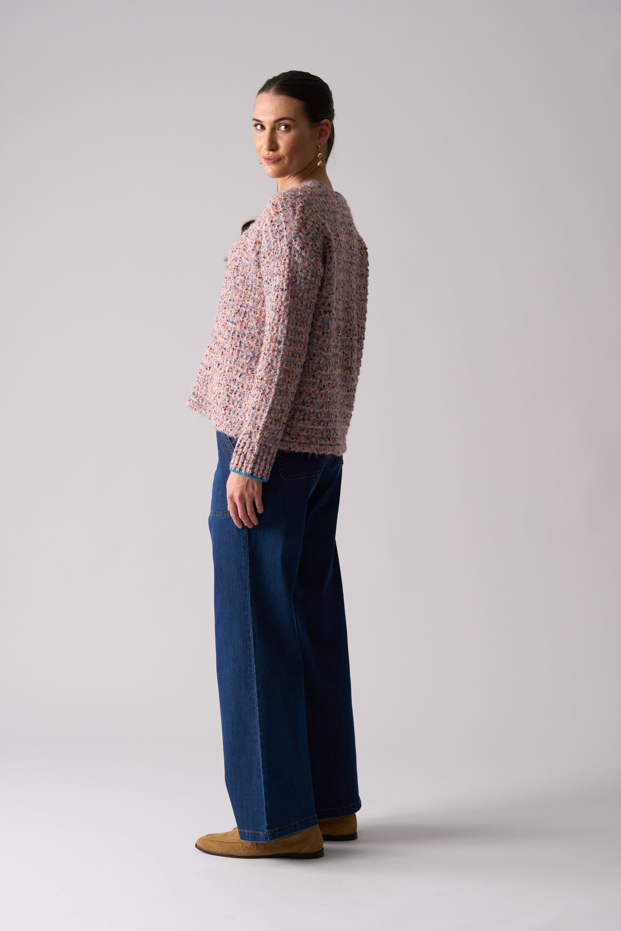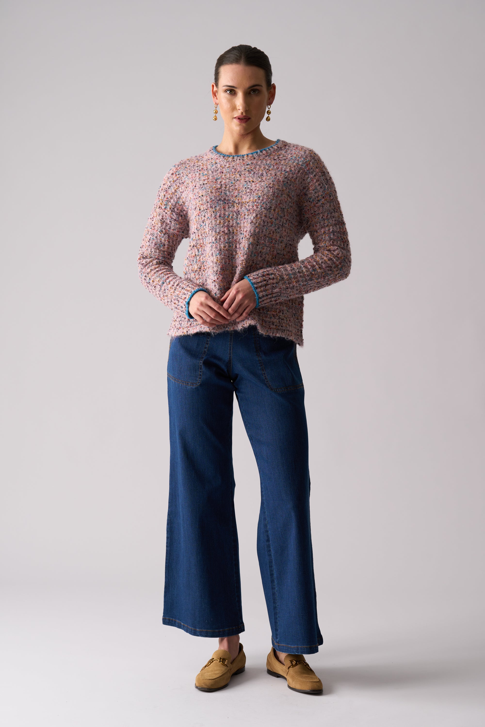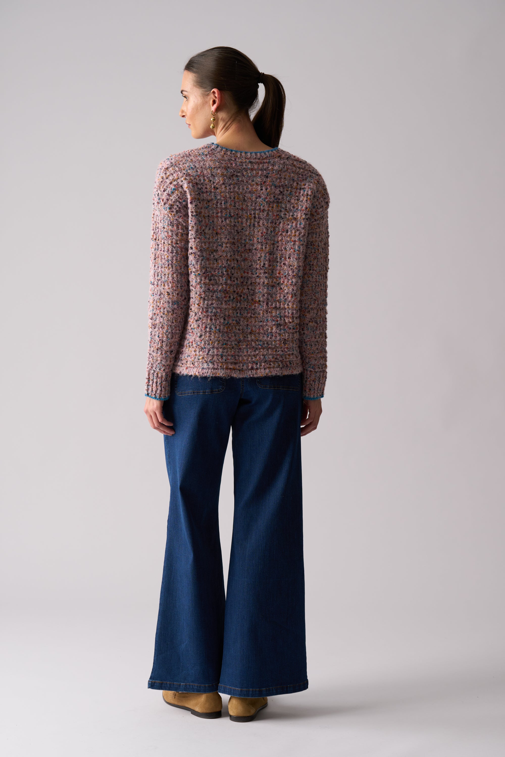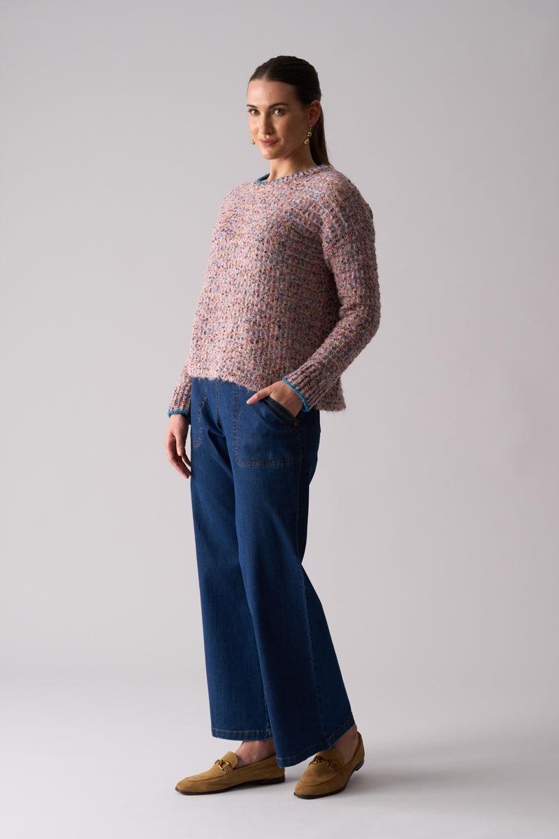 A chunky knit in multi-coloured, lofty yarn with bright tipping at the neckline and cuffs.