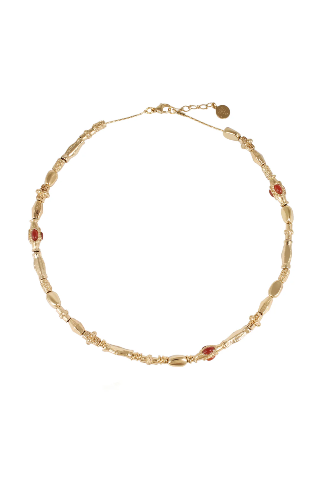24k Gold-plated necklace featuring various pearls and rings of different shapes and Glass crystal embellishments.