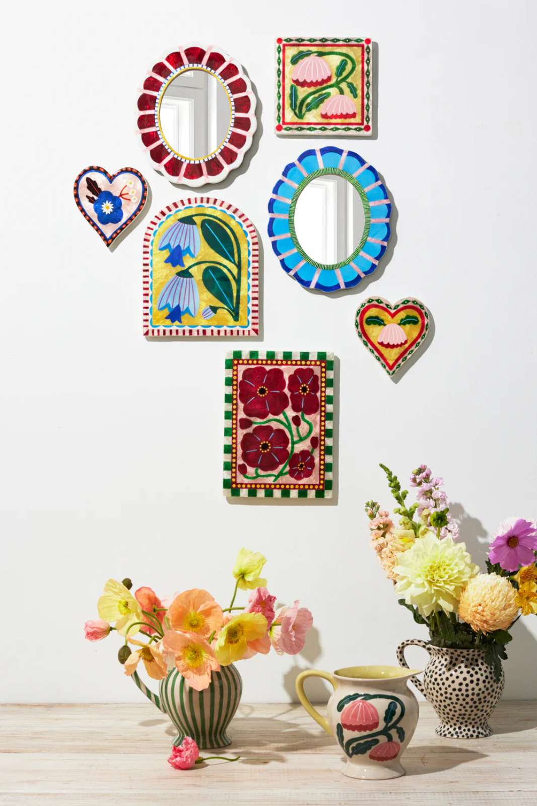 Discover Bloom Nouveau: a premium wall art collection blending Art Nouveau inspiration for a joyful contemporary home aesthetic. Featuring Capiz shell tiles and mirrors, each piece showcases vibrant hand-painted florals alongside bold graphic patterns. These versatile artworks combine nature-inspired motifs with contemporary designs, creating stunning displays that elevate any space.