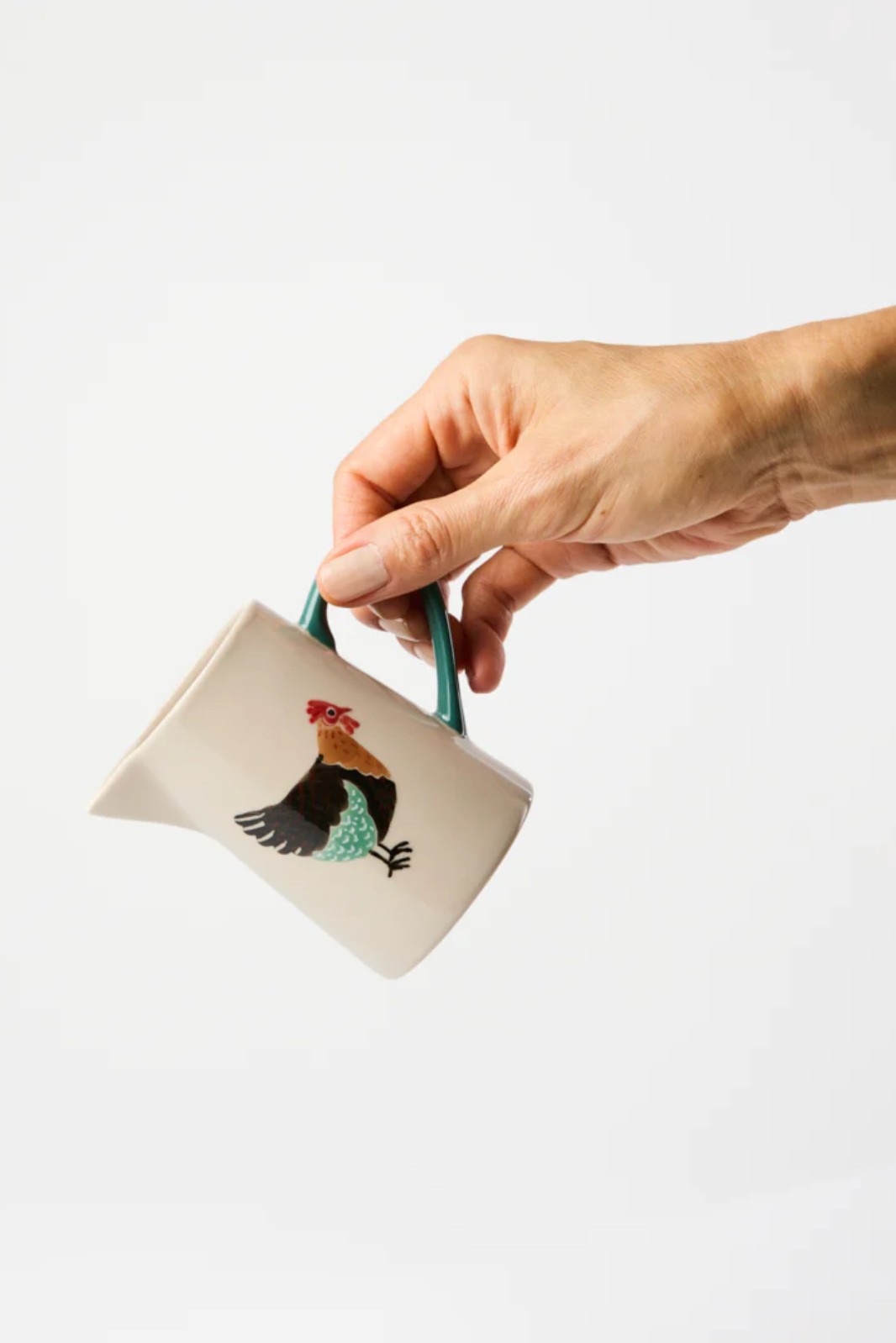 Adorned with a hand-painted rooster in earthy hues, this earthenware milk jug features a distinctive green handle for character and function. Their Sydney-designed Clover Milk Jug transforms everyday pouring into an occasion, each piece individually painted by Vietnamese artisans who honour their craft heritage.