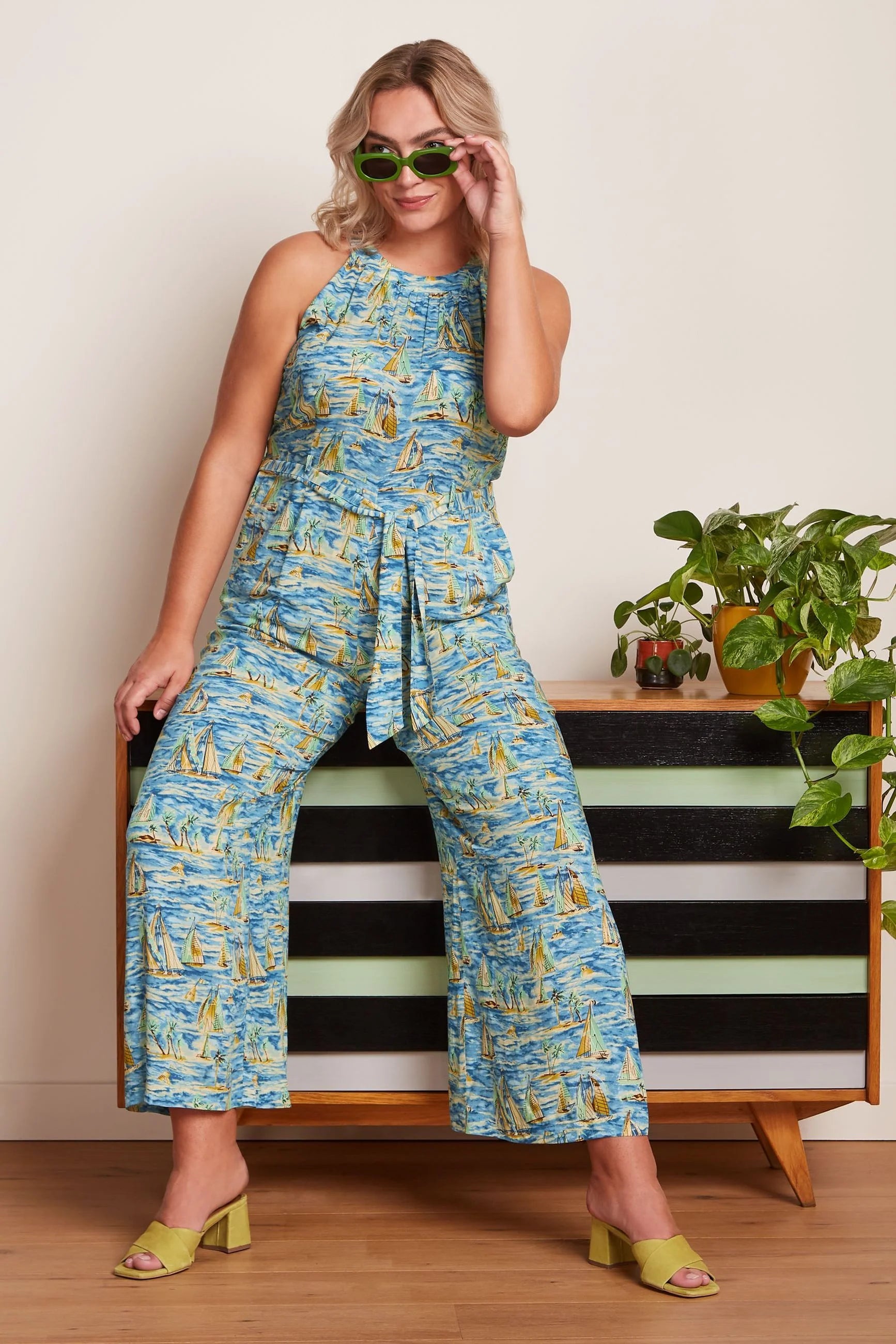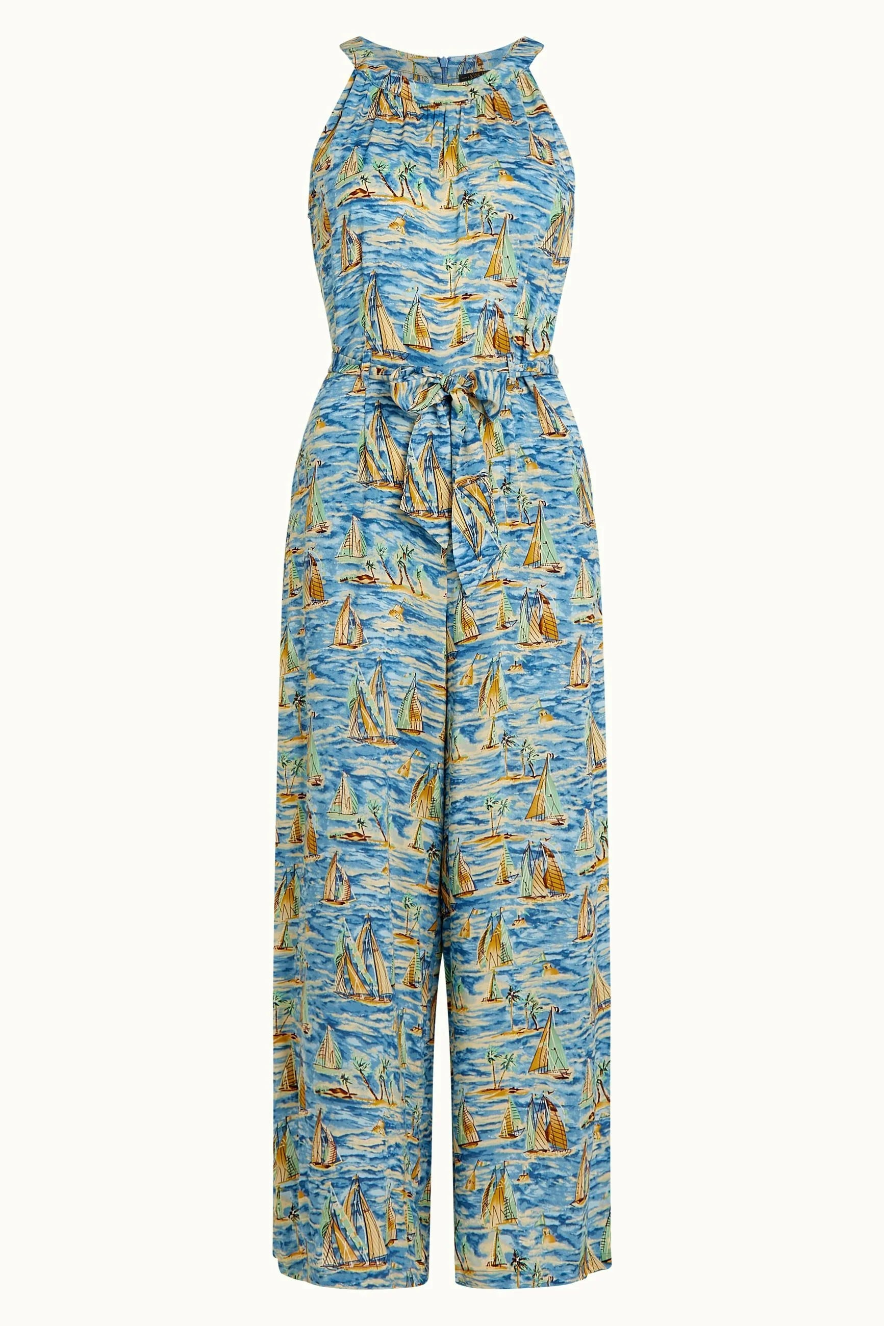 The Virna versatile jumpsuit with is a stylish halter neckline, practical side pockets, and a defining belt at the waist. In light viscose fabric