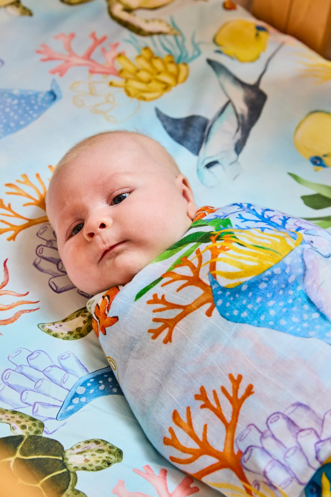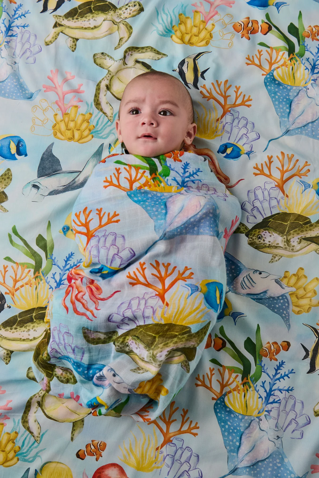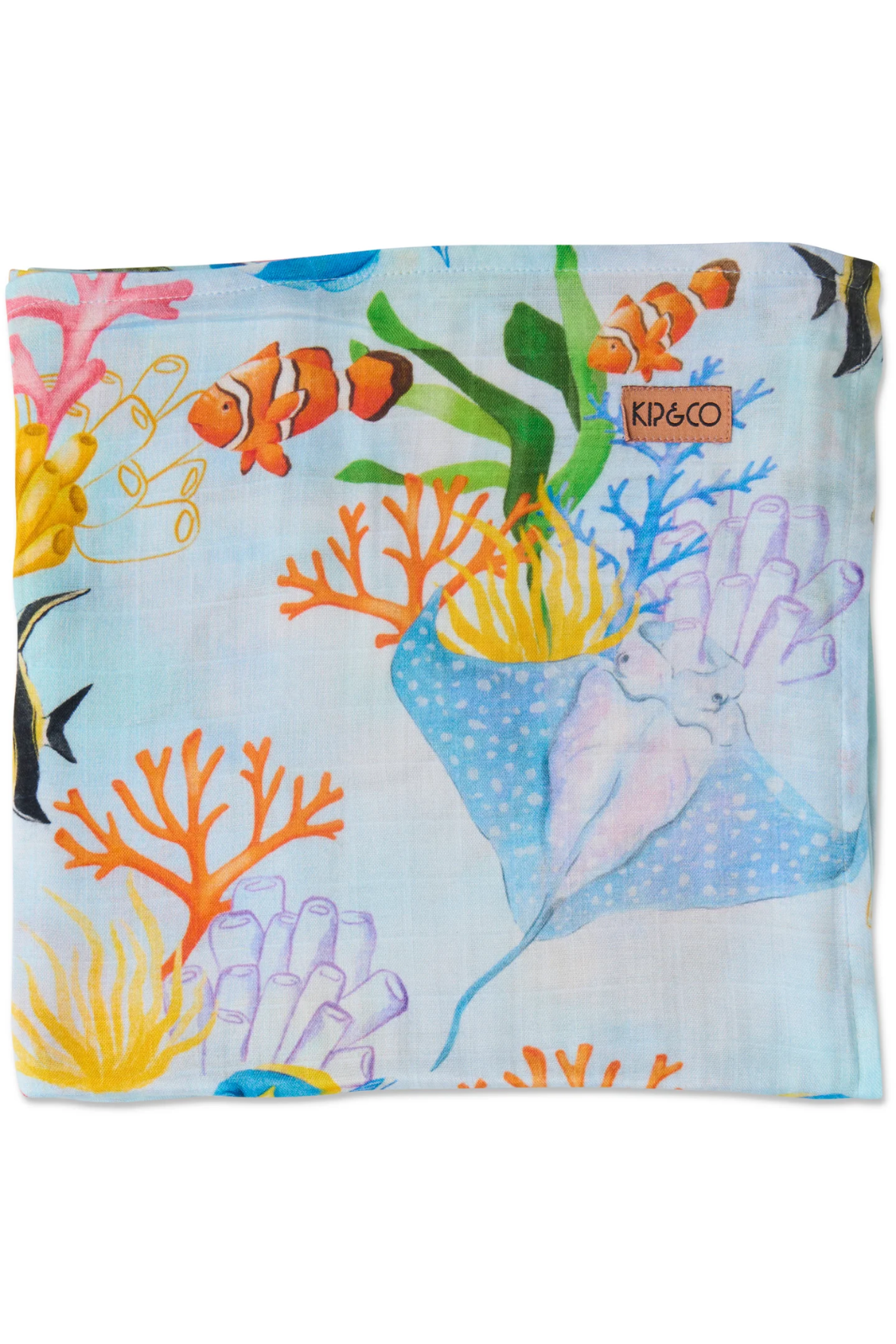 A true all-rounder for your little bundle! Our Reef Life Bamboo Swaddle is buttery soft, breathable, and oh-so-versatile, perfect for wrapping up bub like a cosy burrito, draping over the pram for on-the-go snoozes, or doubling as a comfort blankie for cuddles anytime, anywhere. Generously sized and made from dreamy bamboo fabric, it’s gentle on delicate skin and built for everyday use. Handy, snuggly, and packed with signature Kip&Co colour, it’s your baby's bag’s new best friend. The Reef Life print features an under the sea utopia, with a colony of corals alongside sea turtles, stingrays, octopus and fish, all on a dreamy blue base.