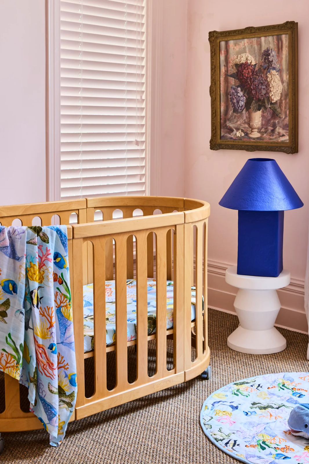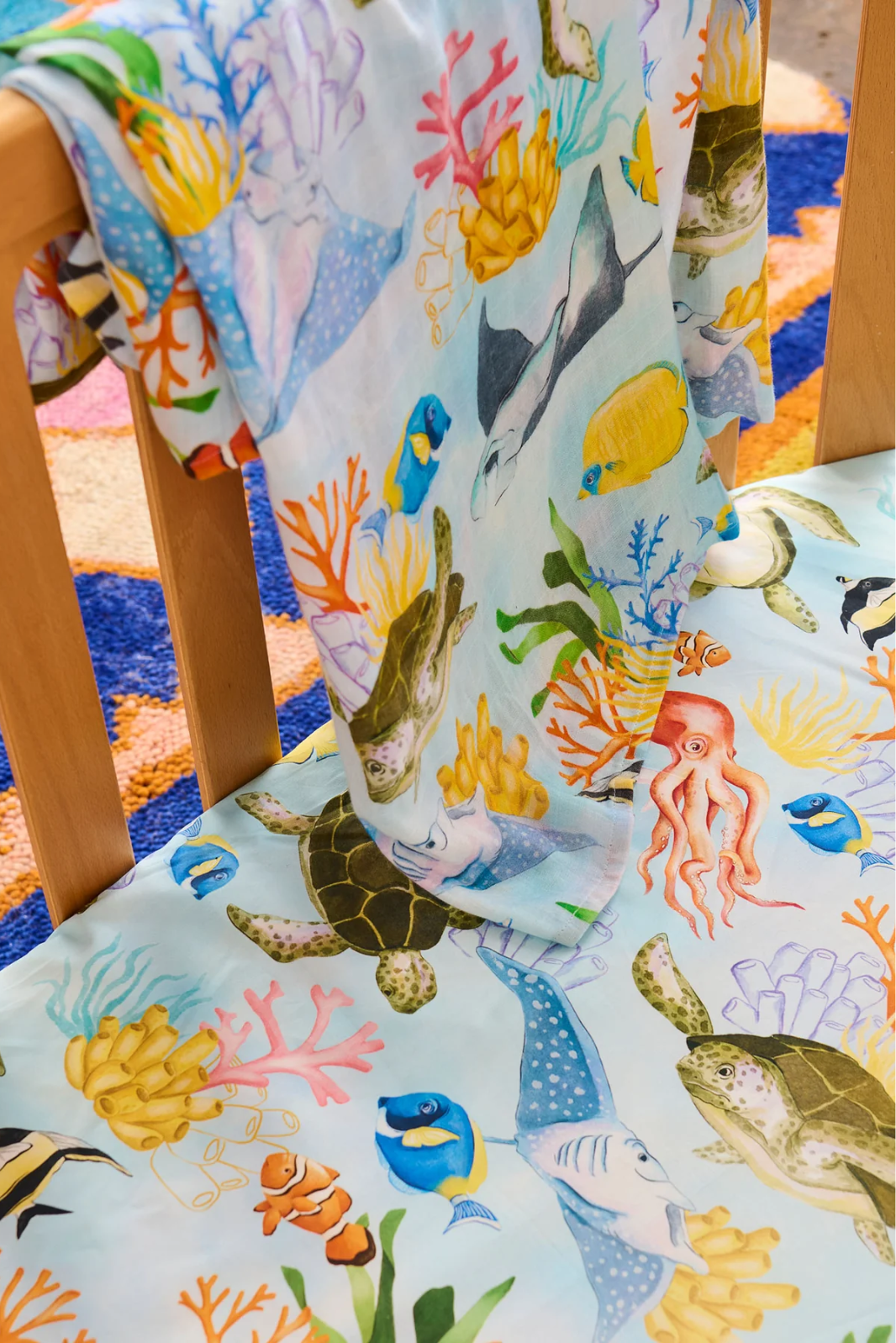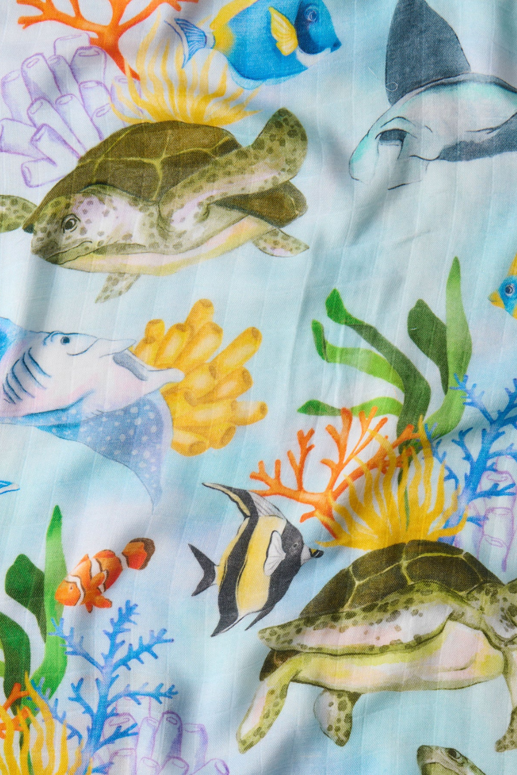 A true all-rounder for your little bundle! Our Reef Life Bamboo Swaddle is buttery soft, breathable, and oh-so-versatile, perfect for wrapping up bub like a cosy burrito, draping over the pram for on-the-go snoozes, or doubling as a comfort blankie for cuddles anytime, anywhere. Generously sized and made from dreamy bamboo fabric, it’s gentle on delicate skin and built for everyday use. Handy, snuggly, and packed with signature Kip&Co colour, it’s your baby's bag’s new best friend. The Reef Life print features an under the sea utopia, with a colony of corals alongside sea turtles, stingrays, octopus and fish, all on a dreamy blue base.