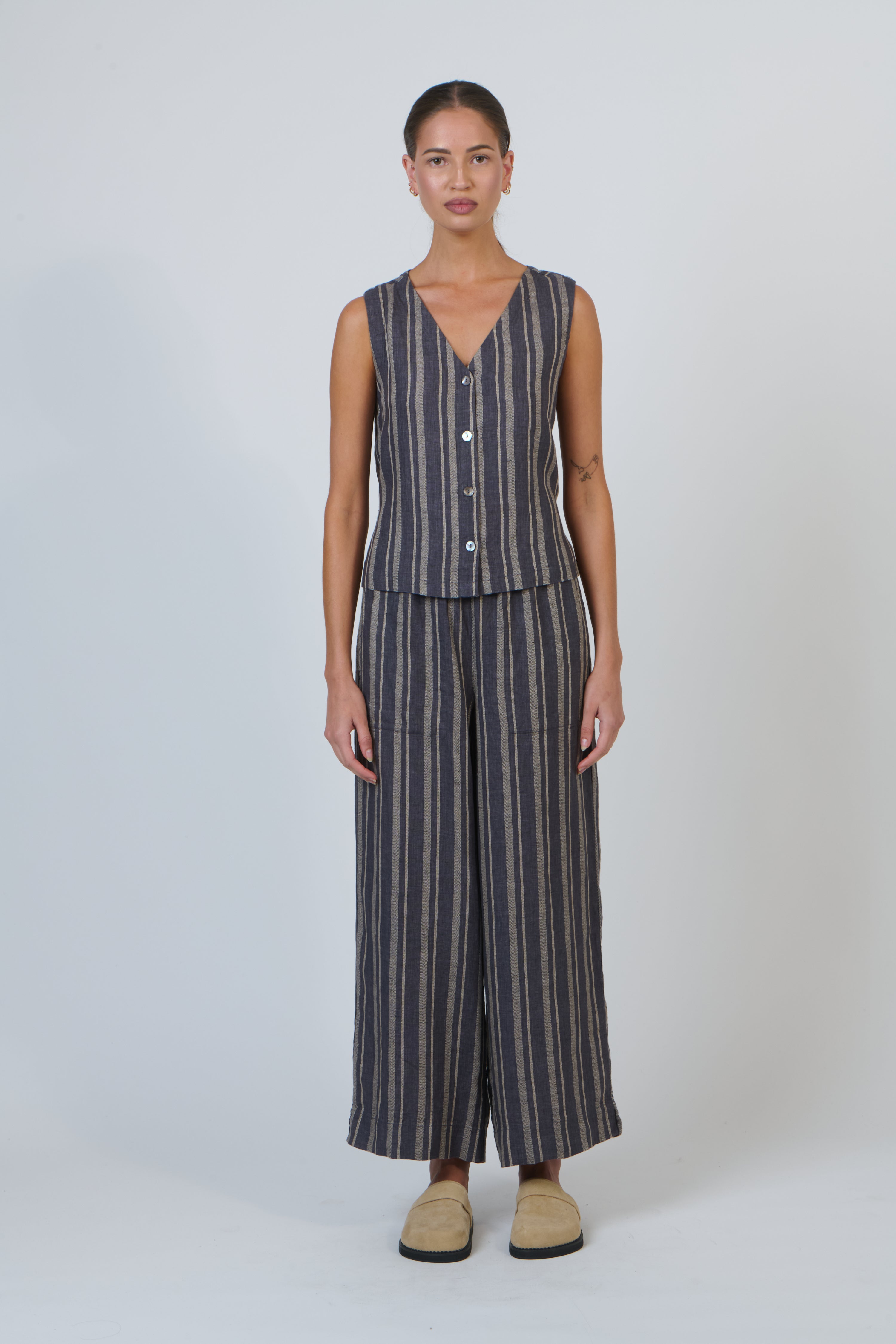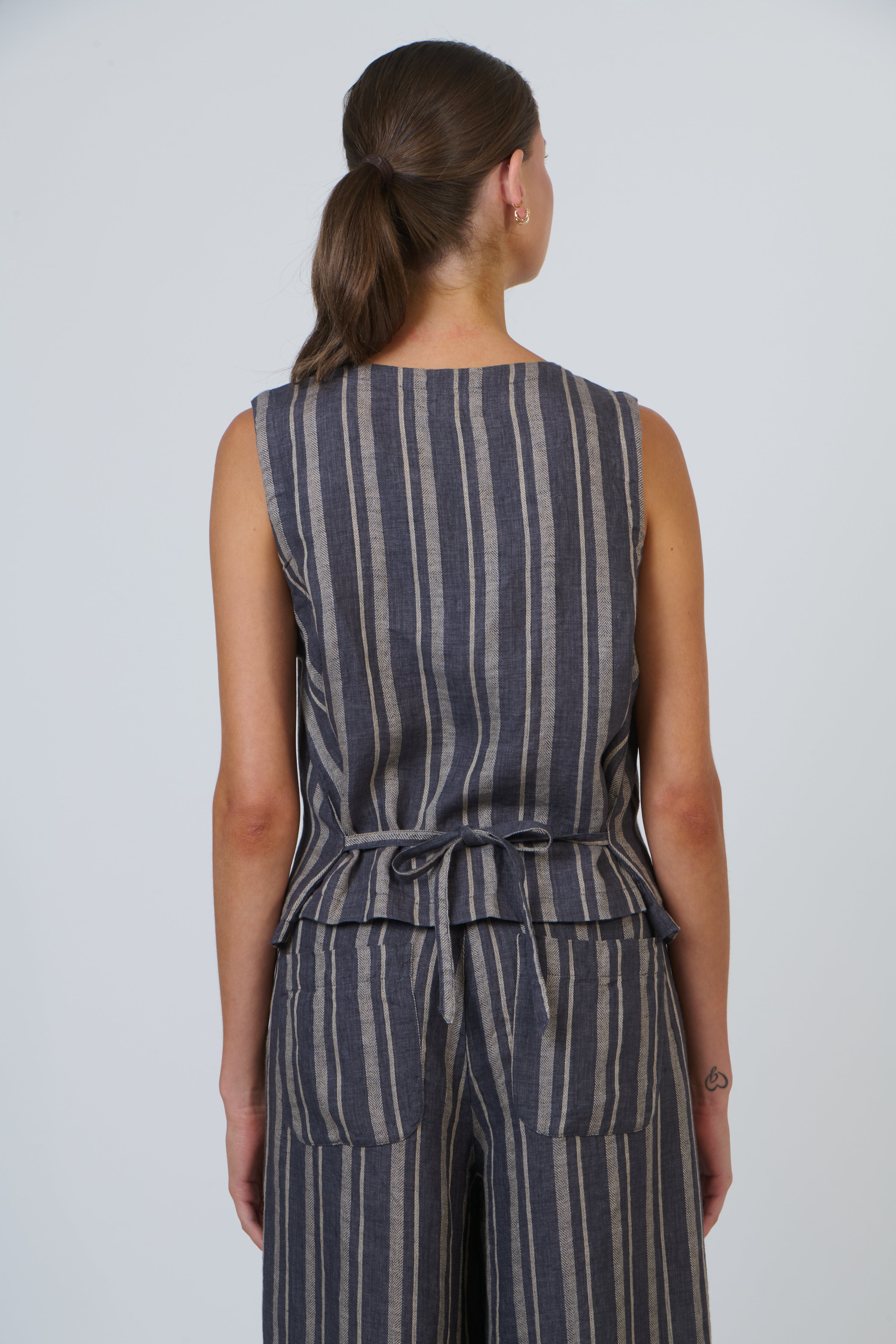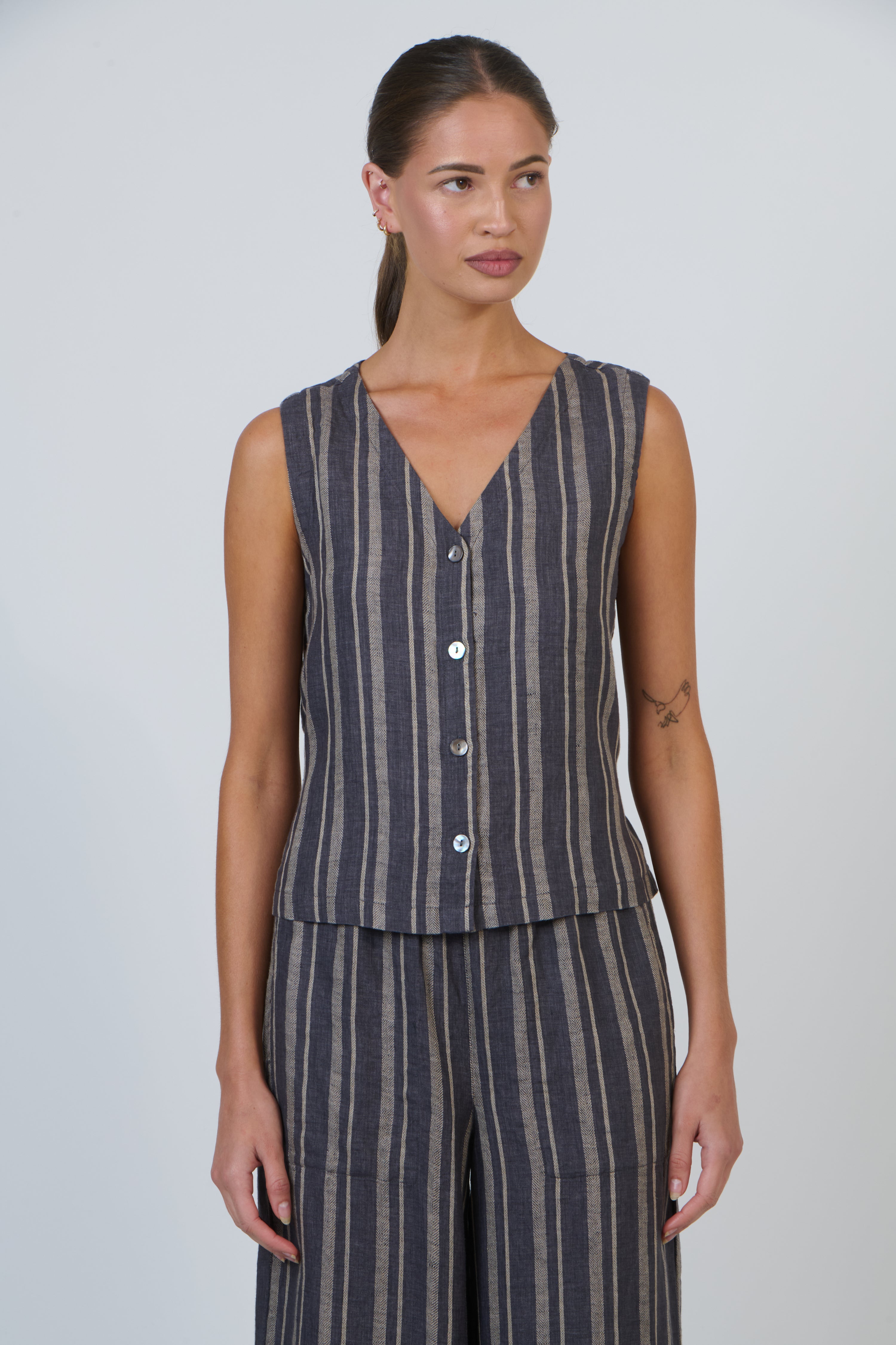 GA580 is a sleeveless 100% linen vest with a flattering V-neckline and button-down front.