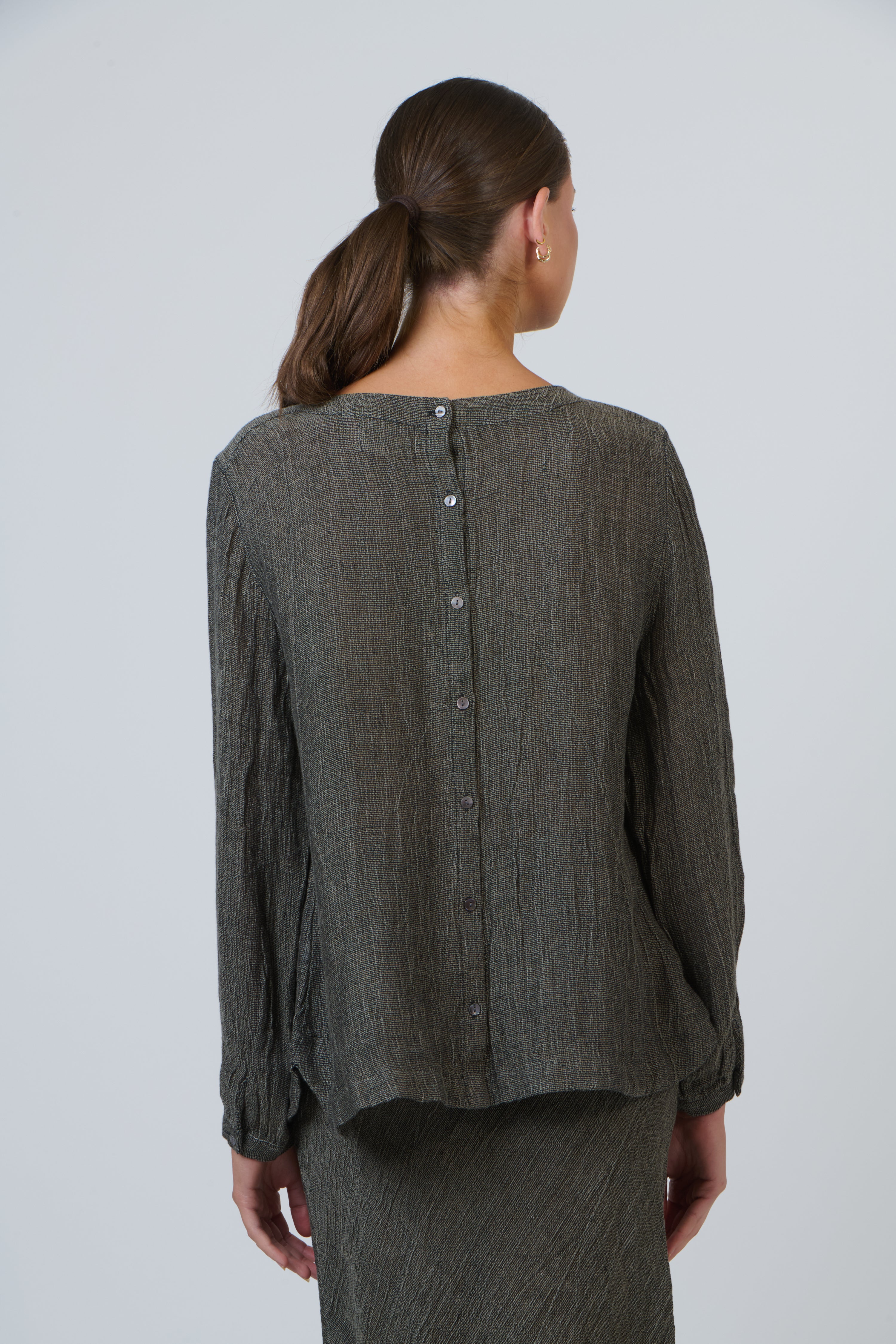 Featuring a softly rounded neckline, button-down back detailing, and gently gathered cuffs, it brings a touch of sophistication to laid-back dressing.