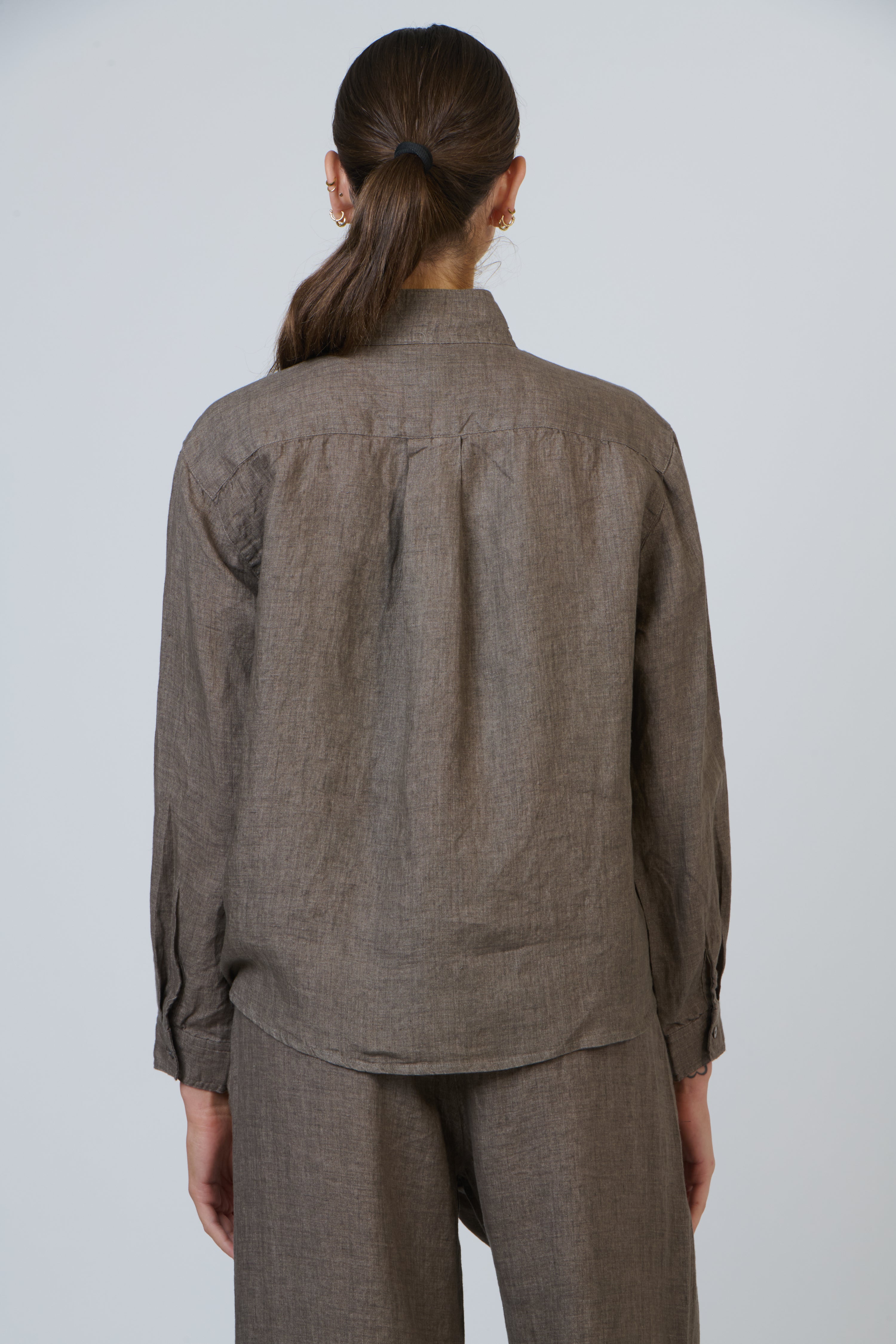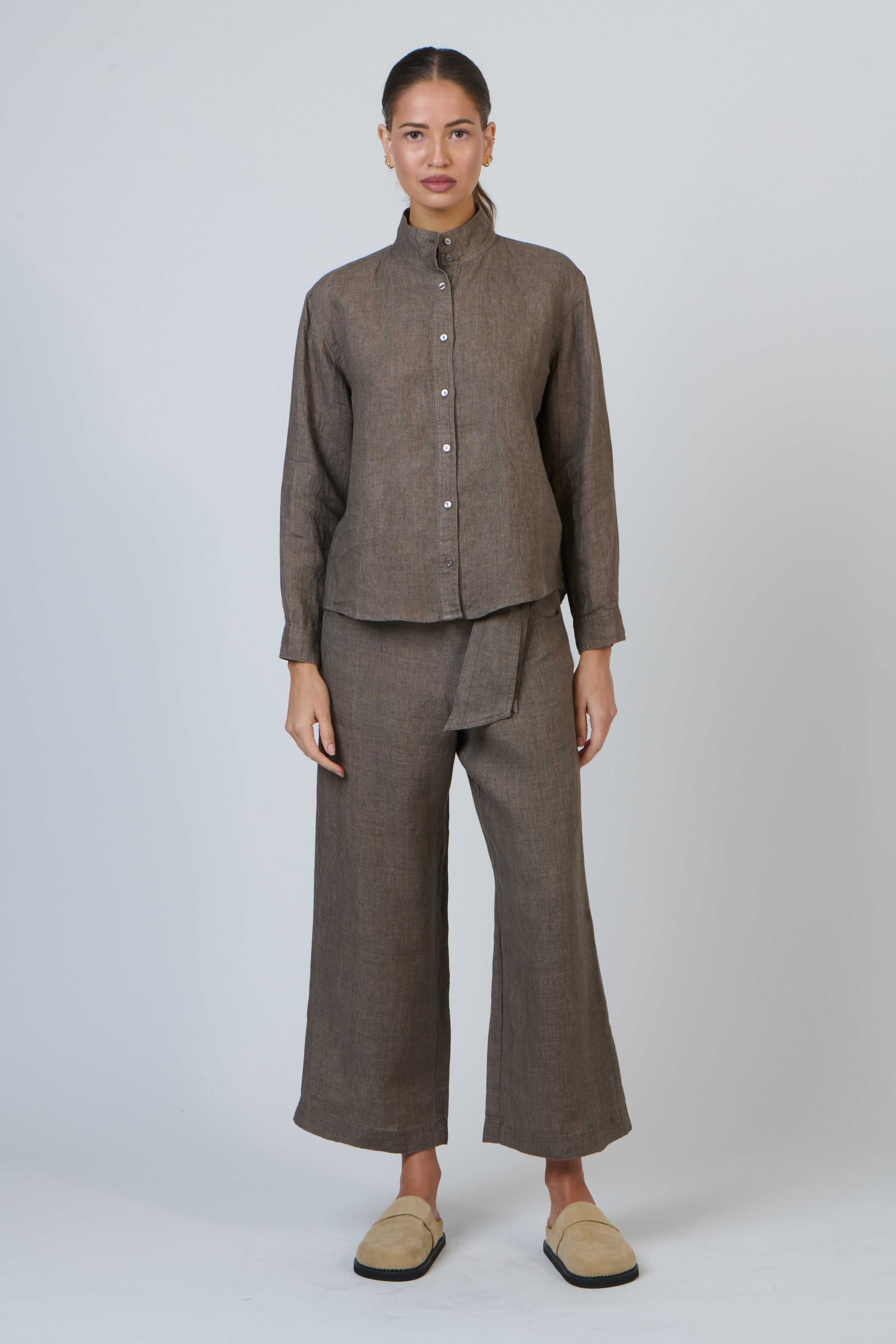 The high stand collar and refined button-down front create a graceful profile, while the lightweight linen drapes beautifully for an effortlessly polished look.