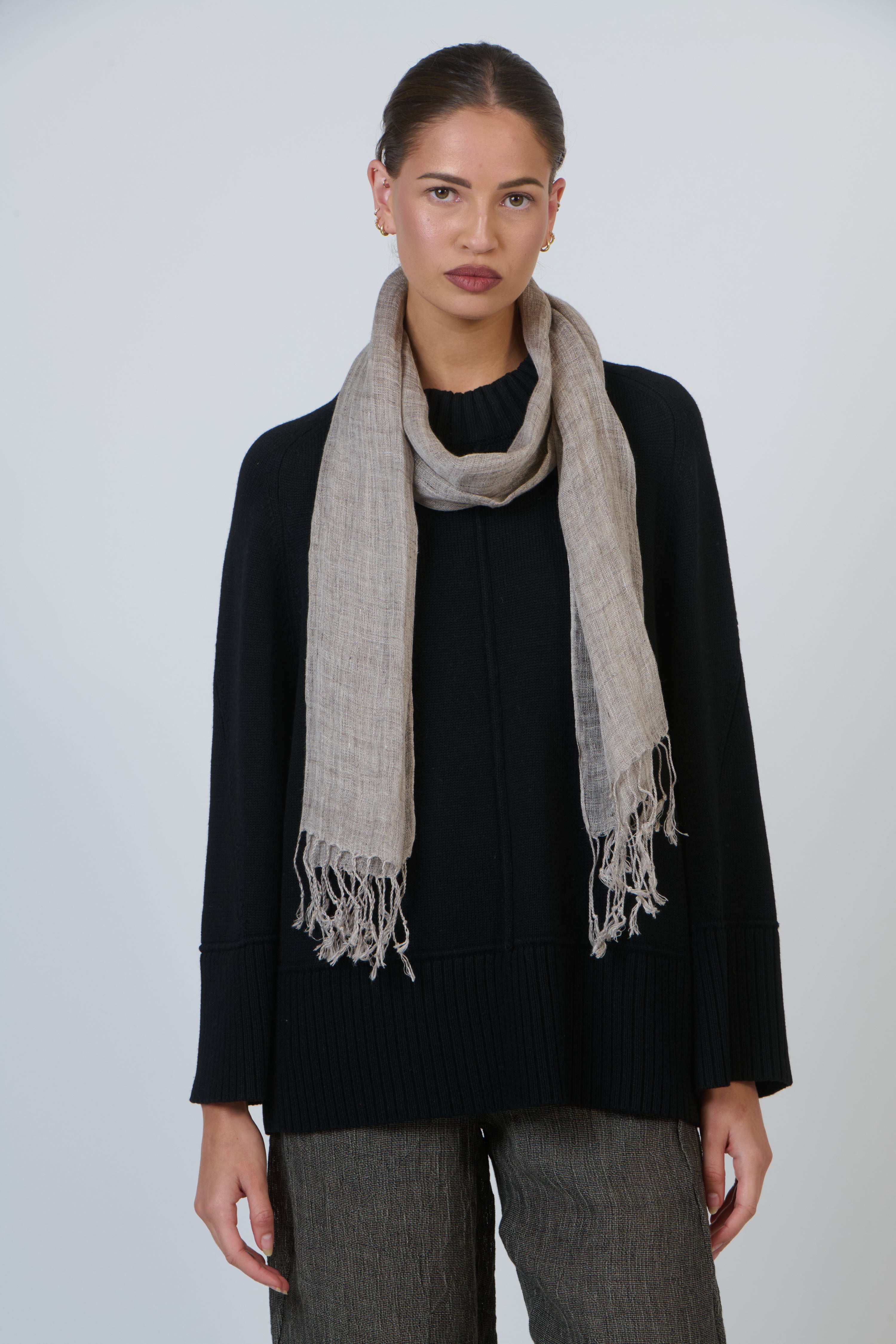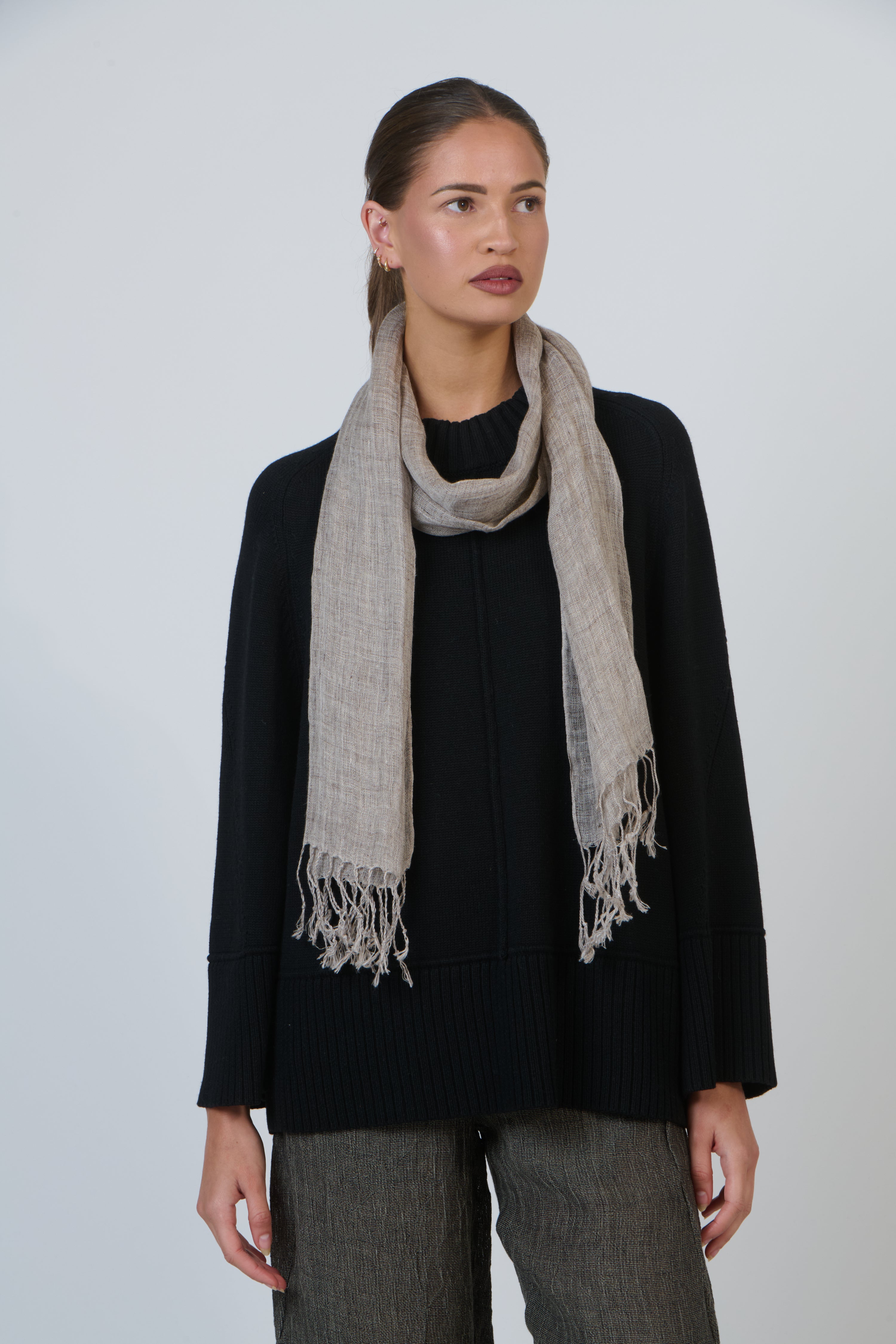 The softly textured weave brings gentle depth, balanced by a clean, unadorned design and knotted fringe ends. Easy to style and endlessly versatile, it layers beautifully over coats, knitwear, or simple shirts.