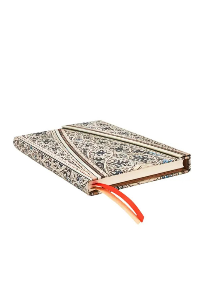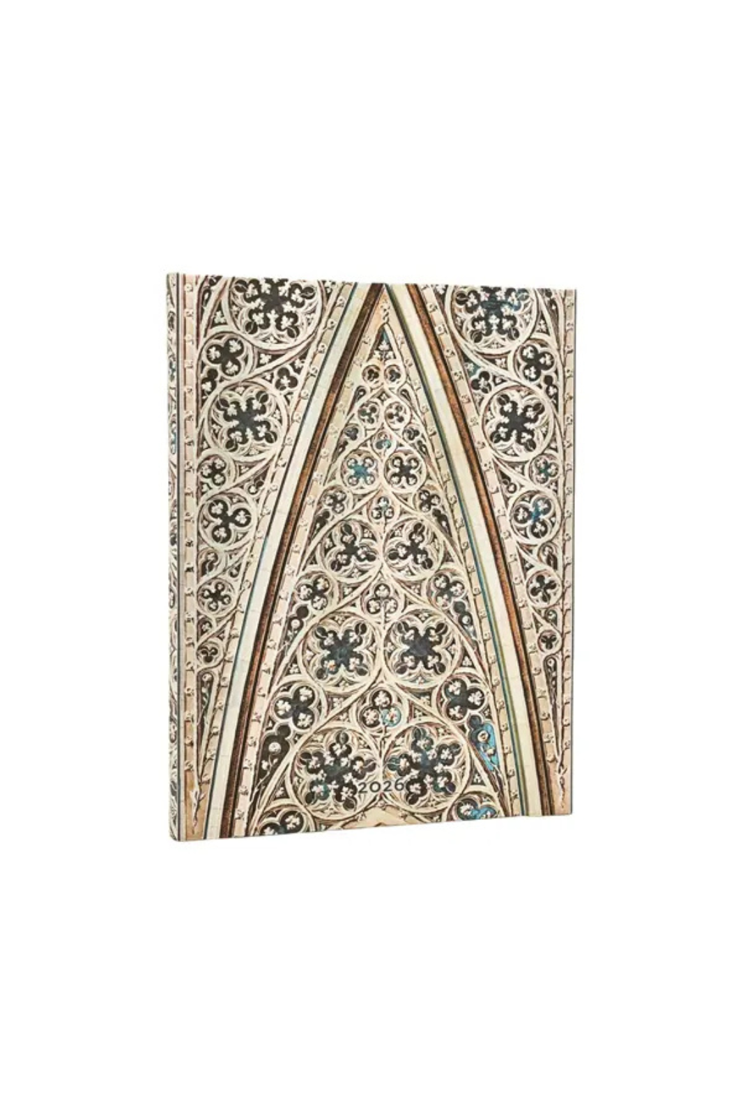 The Duomo di Milano represents the pinnacle of Italian Gothic architecture. The drawing recreated here is part of a series proposed by the architect Paolo Cesa Bianchi for the decoration of the interior vaults of the Cathedral. The soaring arabesques create a sense of a faux relief arborescence over a golden background.