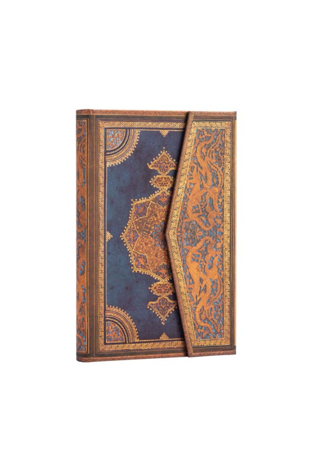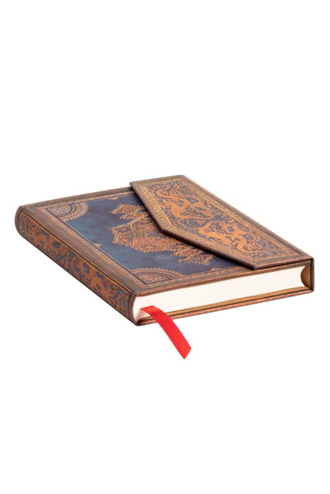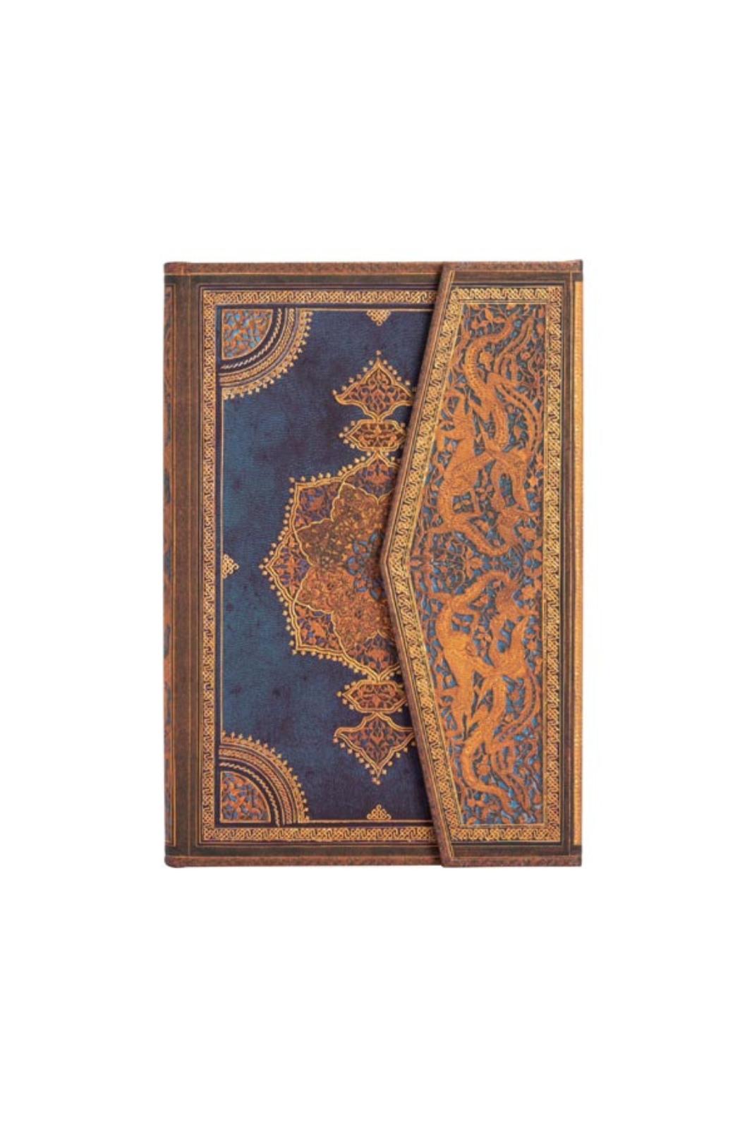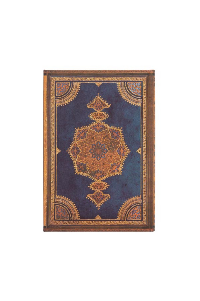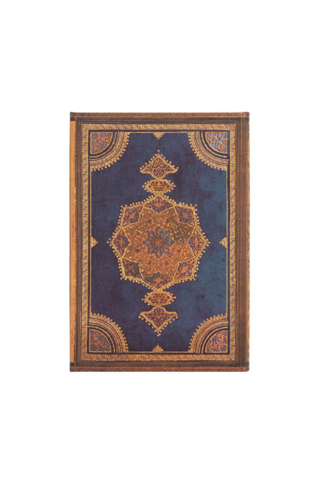 The Safavid Indigo design reproduces a leather filigree pattern incorporating handtooled motifs, retaining the elegance and style of the Islamic Golden Age even in our modern context. Originally released in a classic brown leather look, this new deep blue colour scheme pays tribute to the darkest tone of Persian Blue.